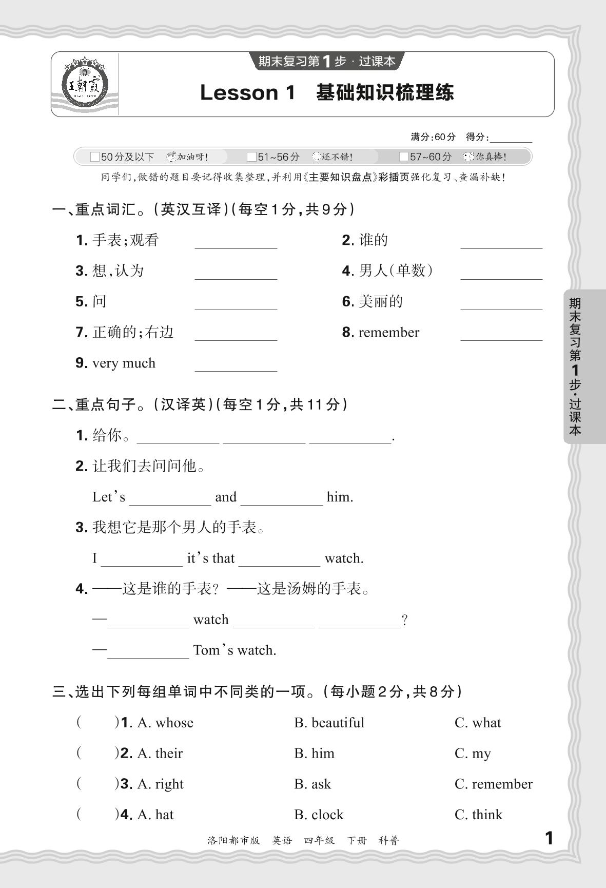 2024春下册四年级英语科普版 期末过课本洛阳版·Lesson 1 基础知识梳理练
