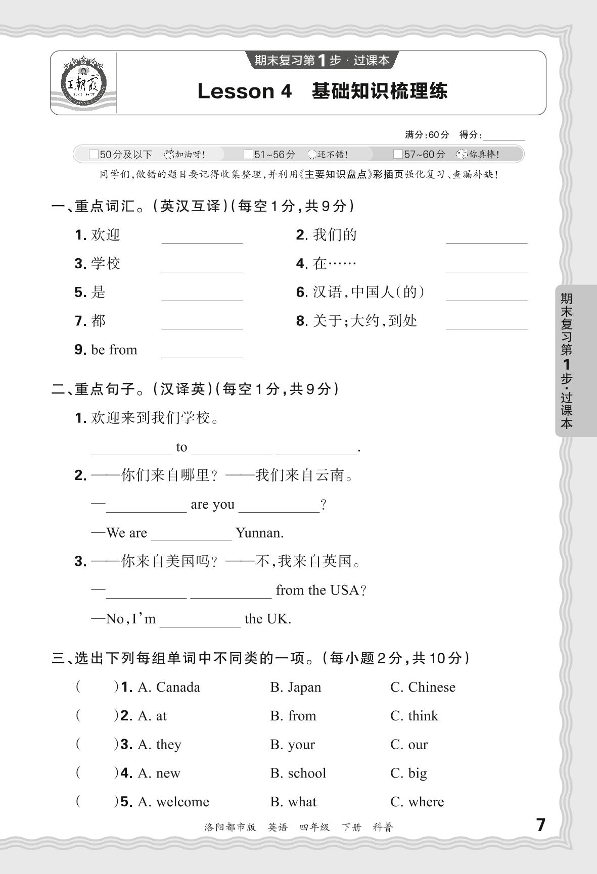 2024春下册四年级英语科普版 期末过课本洛阳版·Lesson 4 基础知识梳理练