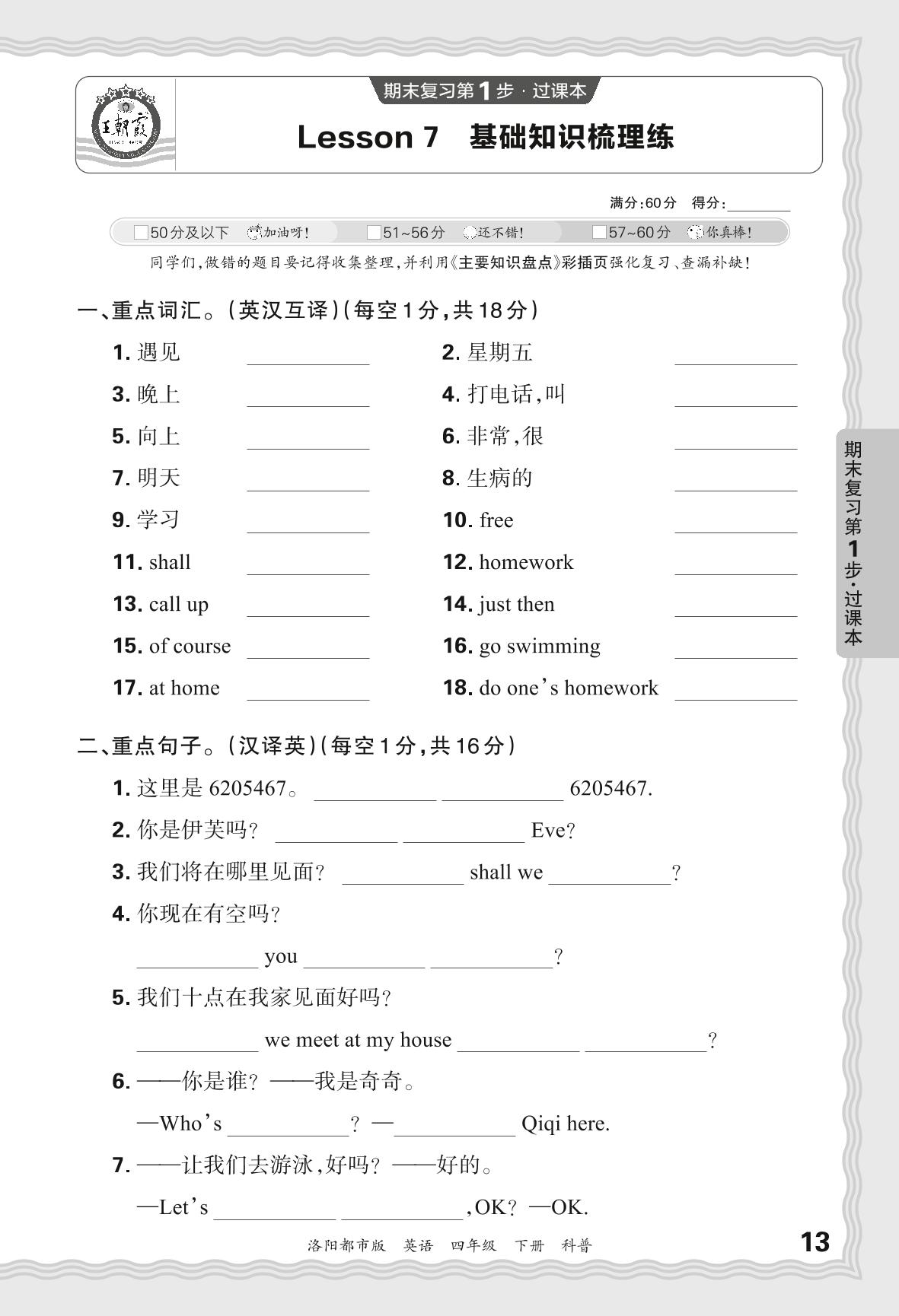2024春下册四年级英语科普版 期末过课本洛阳版·Lesson 7 基础知识梳理练