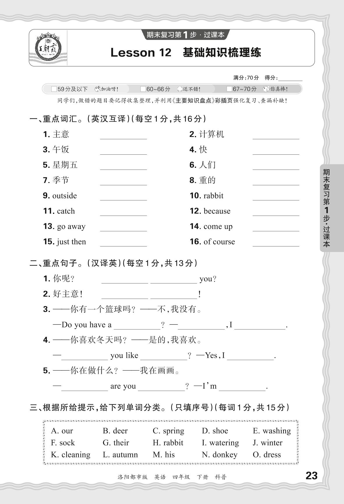 2024春下册四年级英语科普版 期末过课本洛阳版·Lesson 12 基础知识梳理练