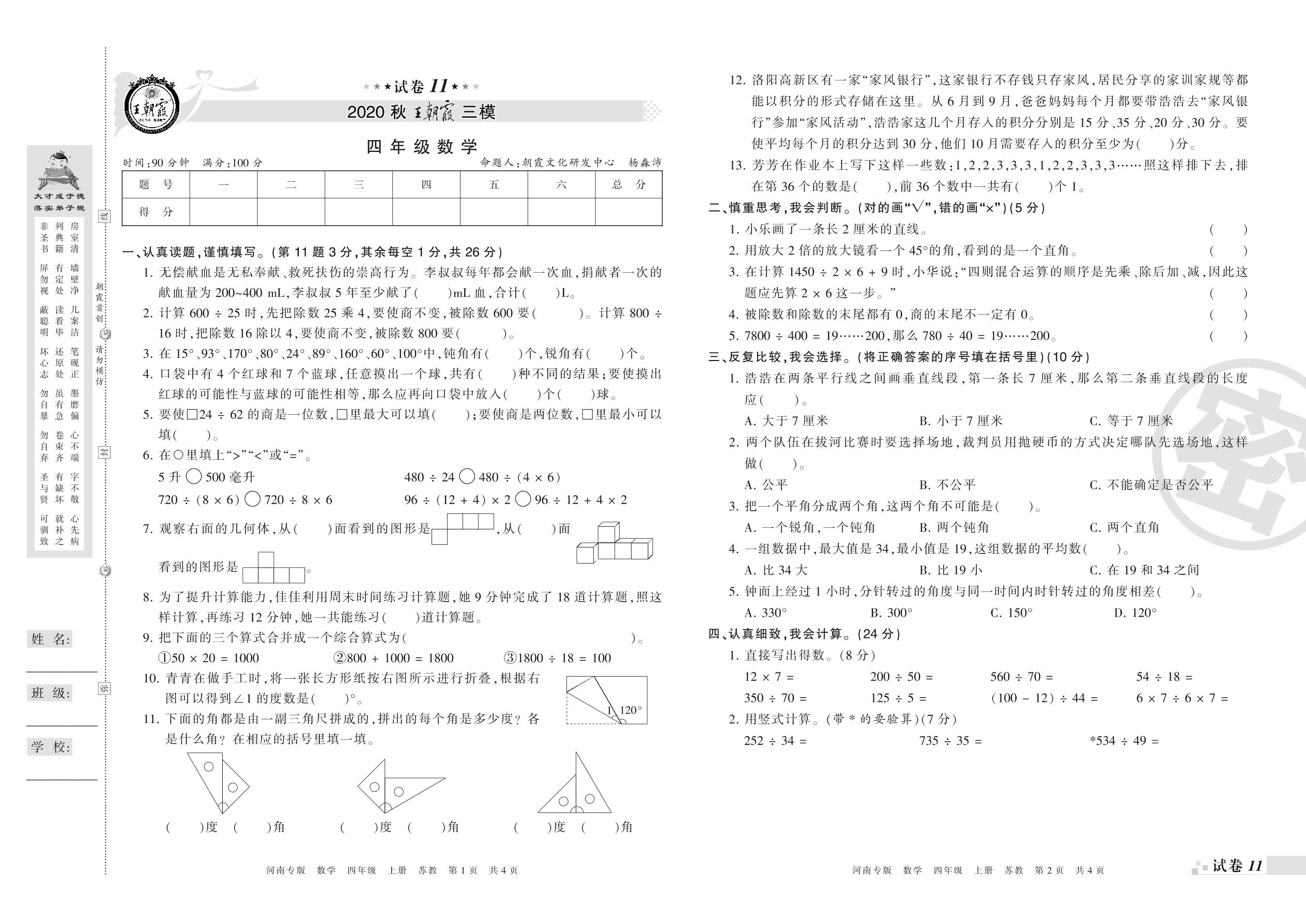 王朝霞期末模拟卷四年级上册数学(苏教版)_R210804140350【11】