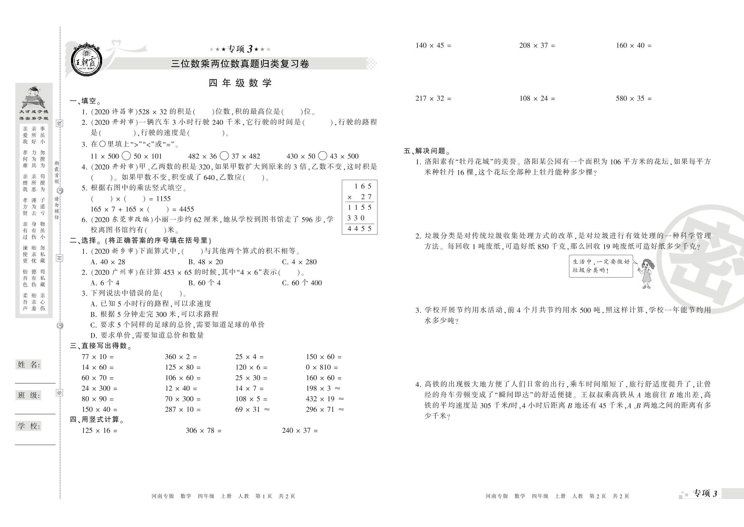 王朝霞期末专项卷——三位数乘两位数、平行四边形和梯形真题归类复习四年级上册数学(人教版)_R210804140358【0】