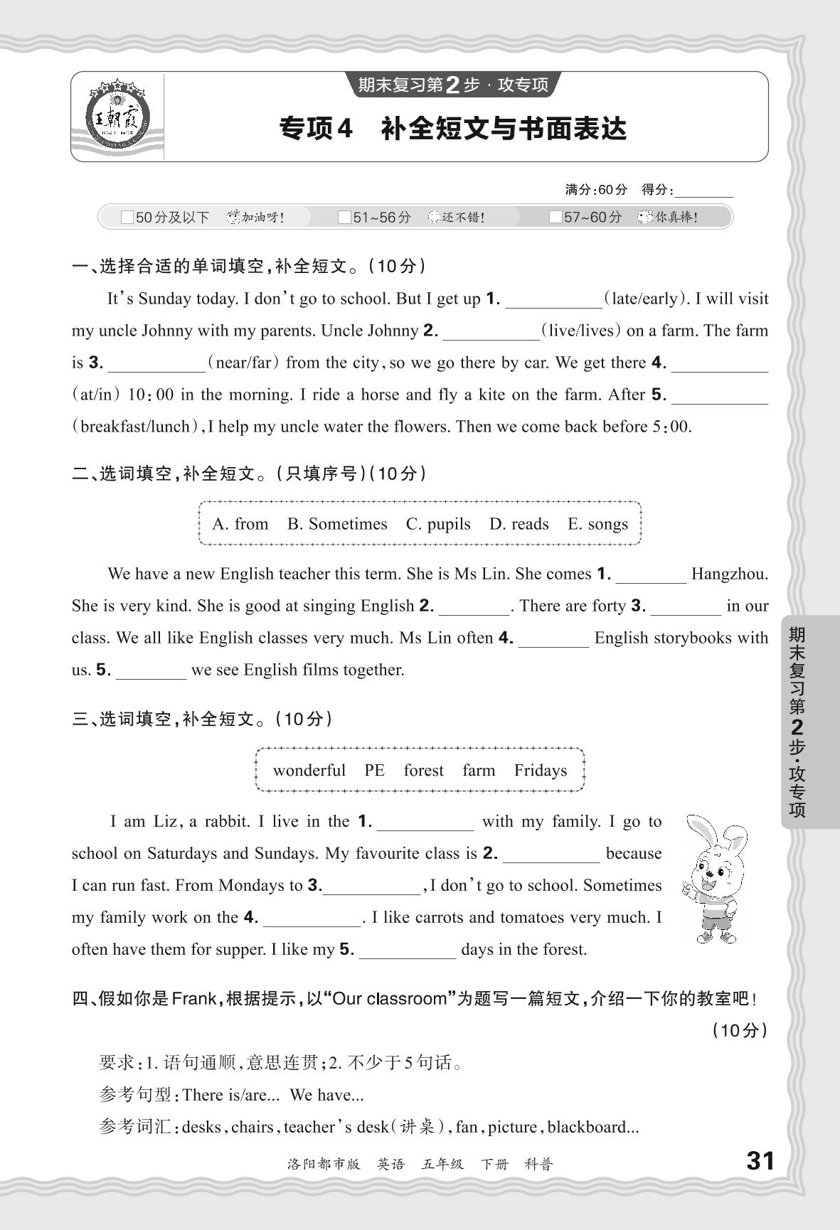 2024春下册五年级英语科普版 期末专项卷洛阳版·补全短文与书面表达【4】