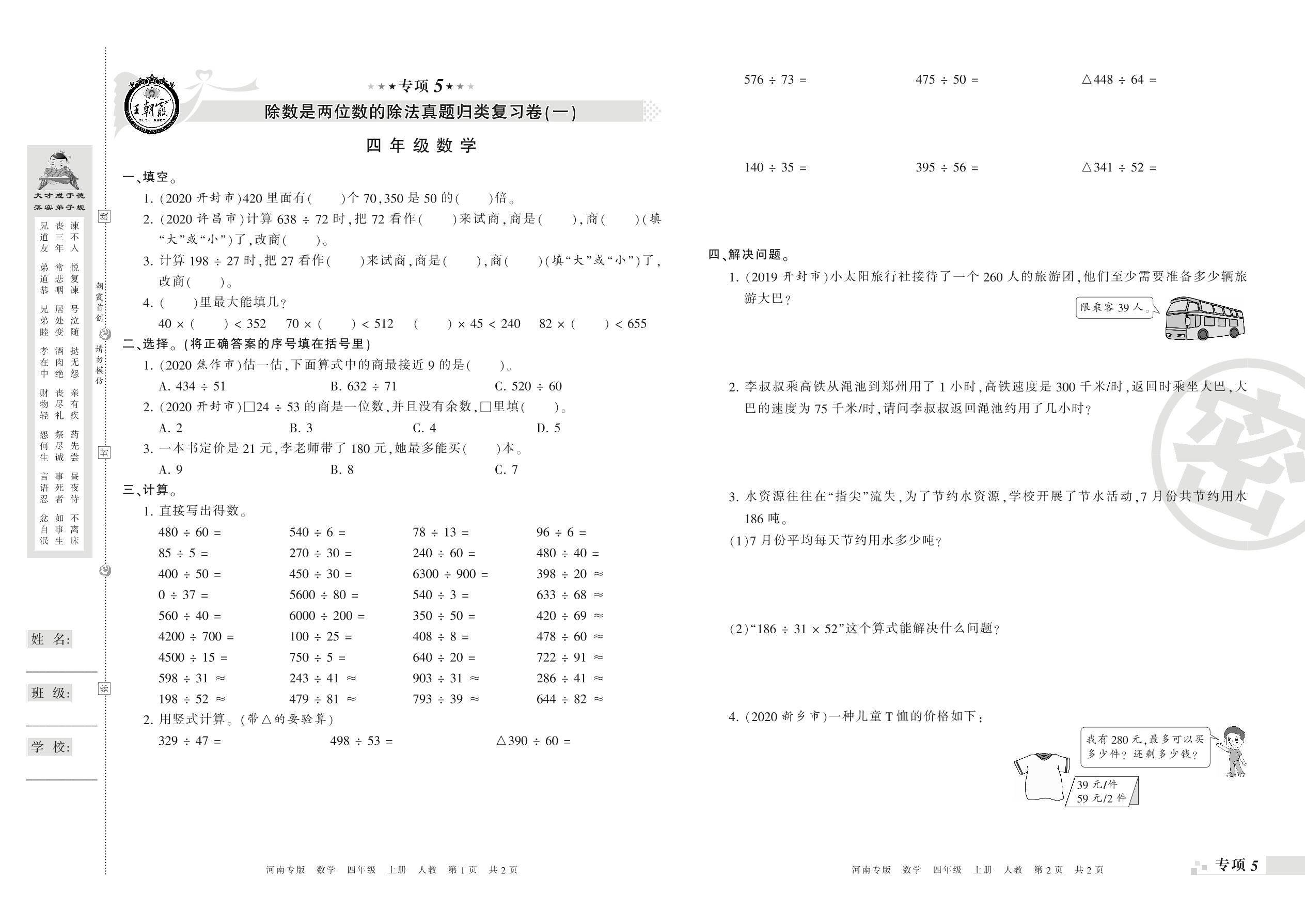 王朝霞期末专项卷——除数是两位数的除法真题归类复习四年级上册数学(人教版)_R210804140405【0】