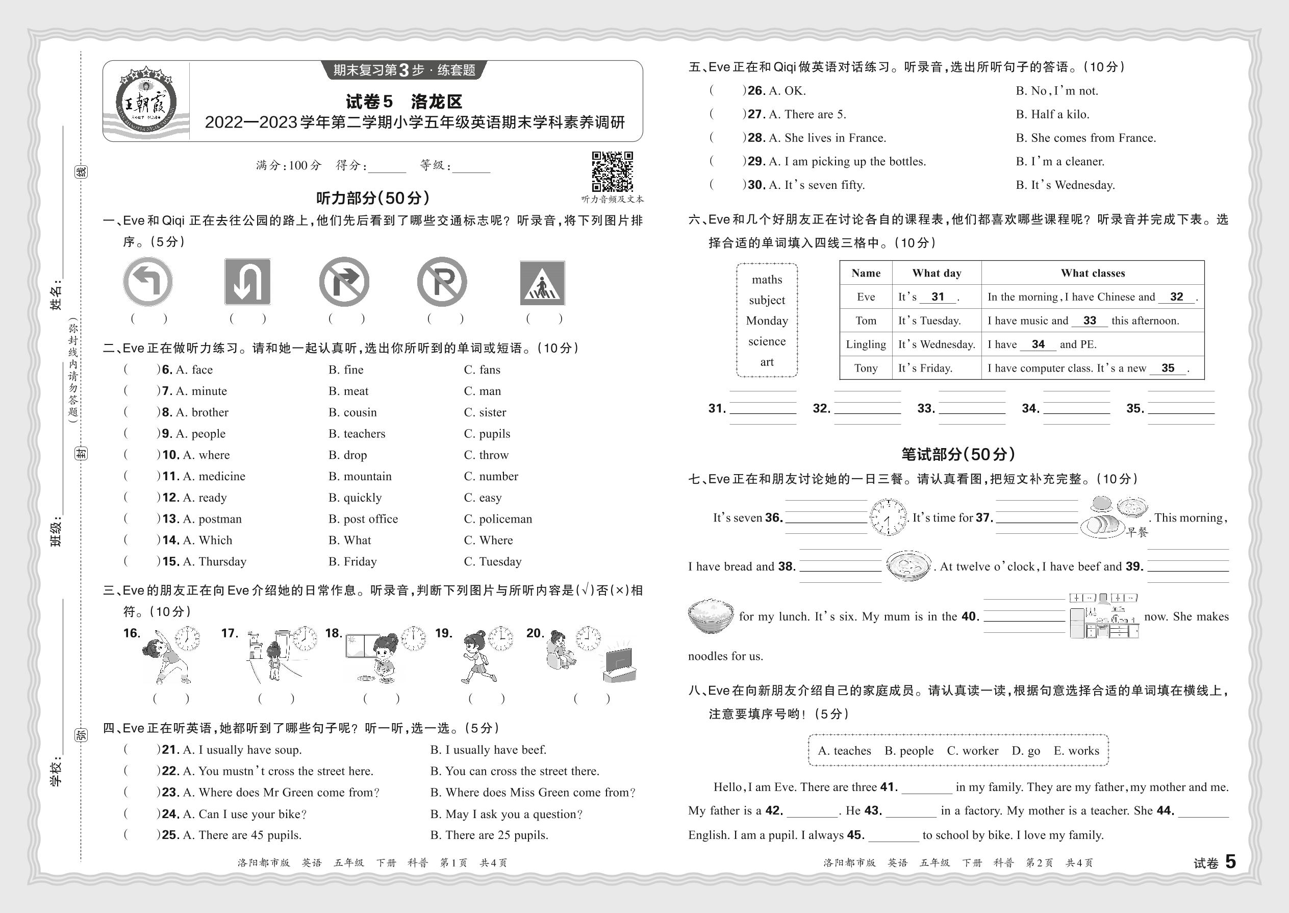 河南省洛阳市洛龙区2022—2023学年第二学期小学五年级英语期末学科素养调研(科普版)【5】