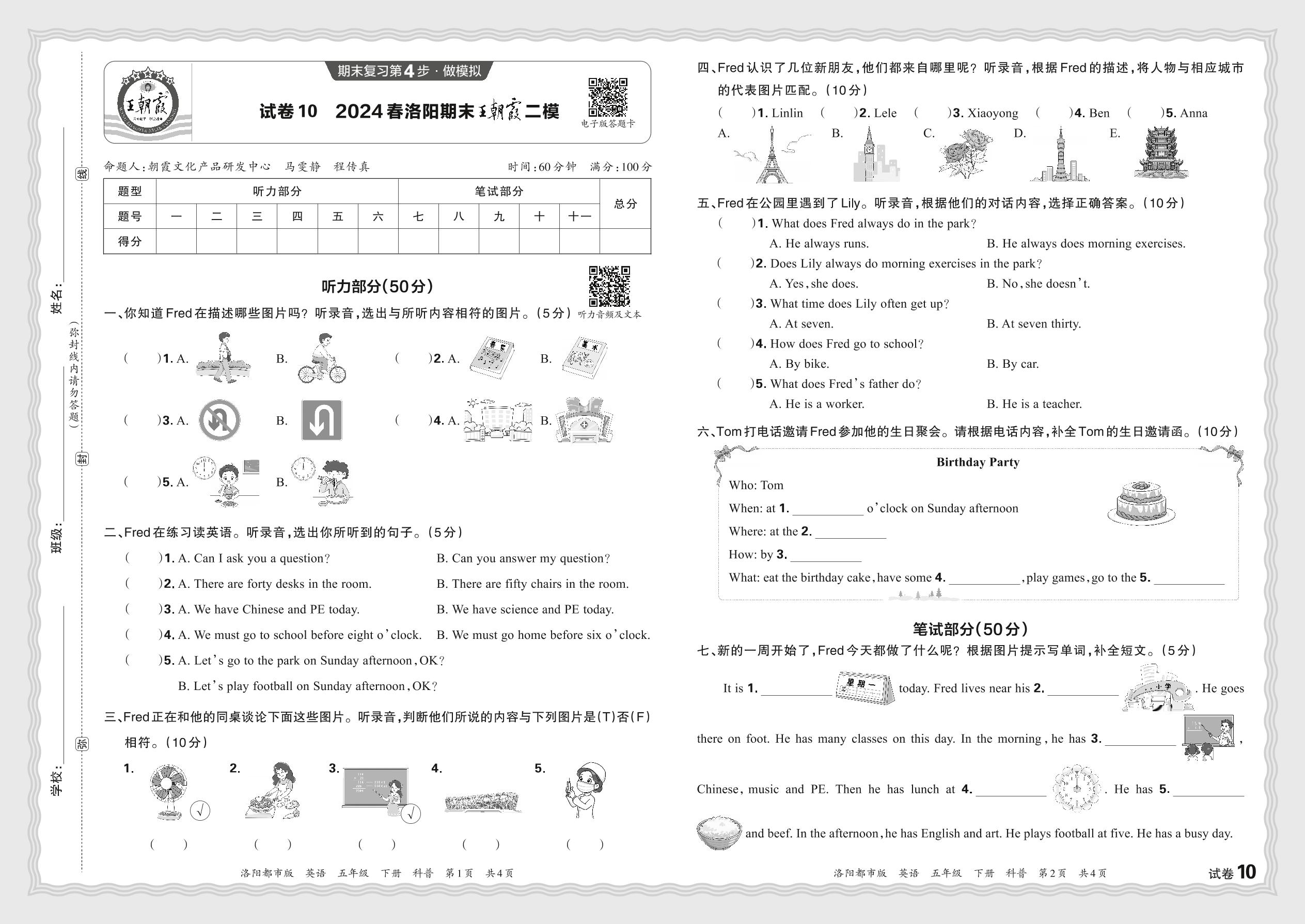 2024春下册五年级英语科普版 河南洛阳期末王朝霞二模【10】