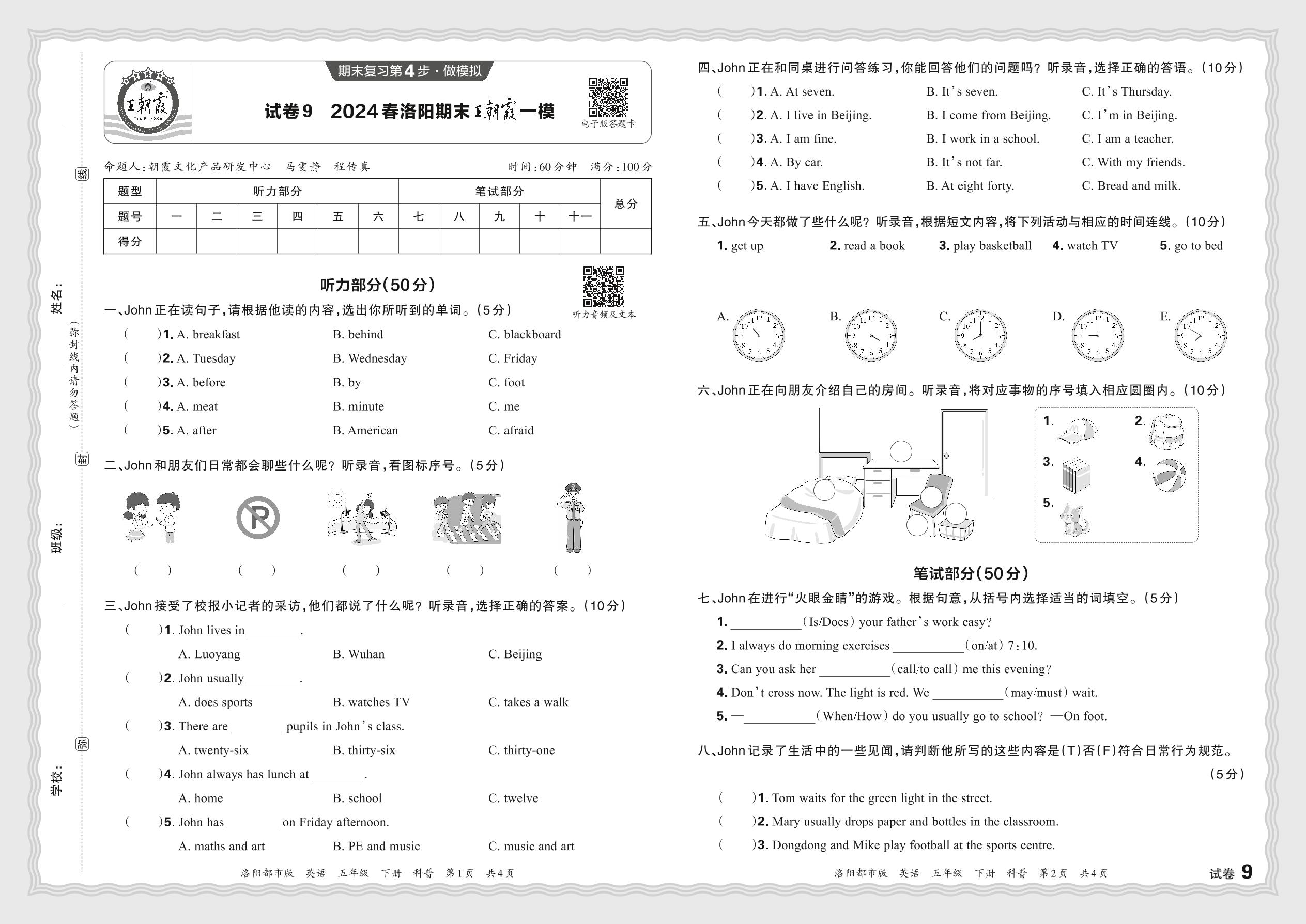2024春下册五年级英语科普版 河南洛阳期末王朝霞一模【9】