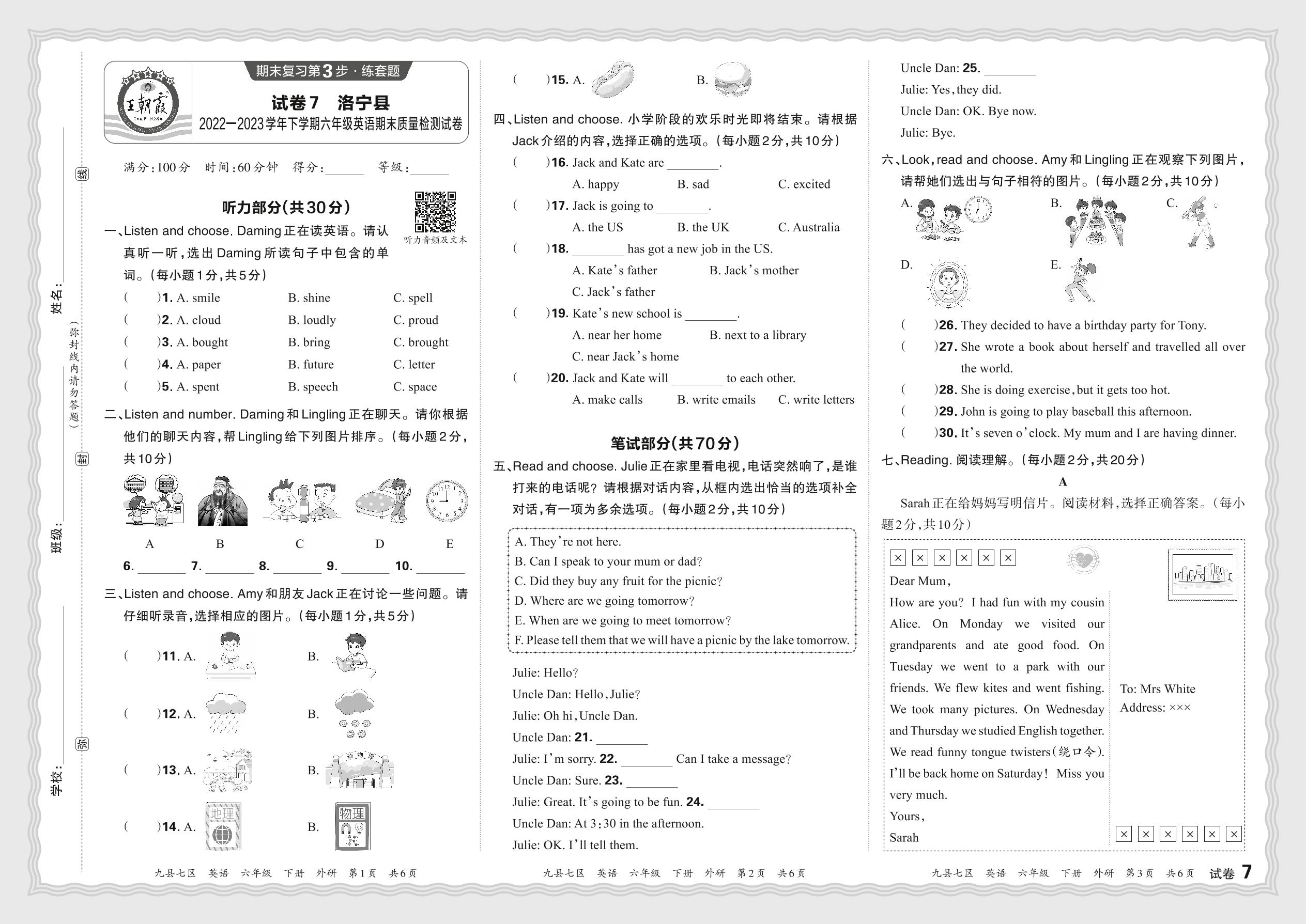 河南省洛阳市洛宁县2022—2023学年下学期六年级英语期末质量检测试卷(外研版)【7】