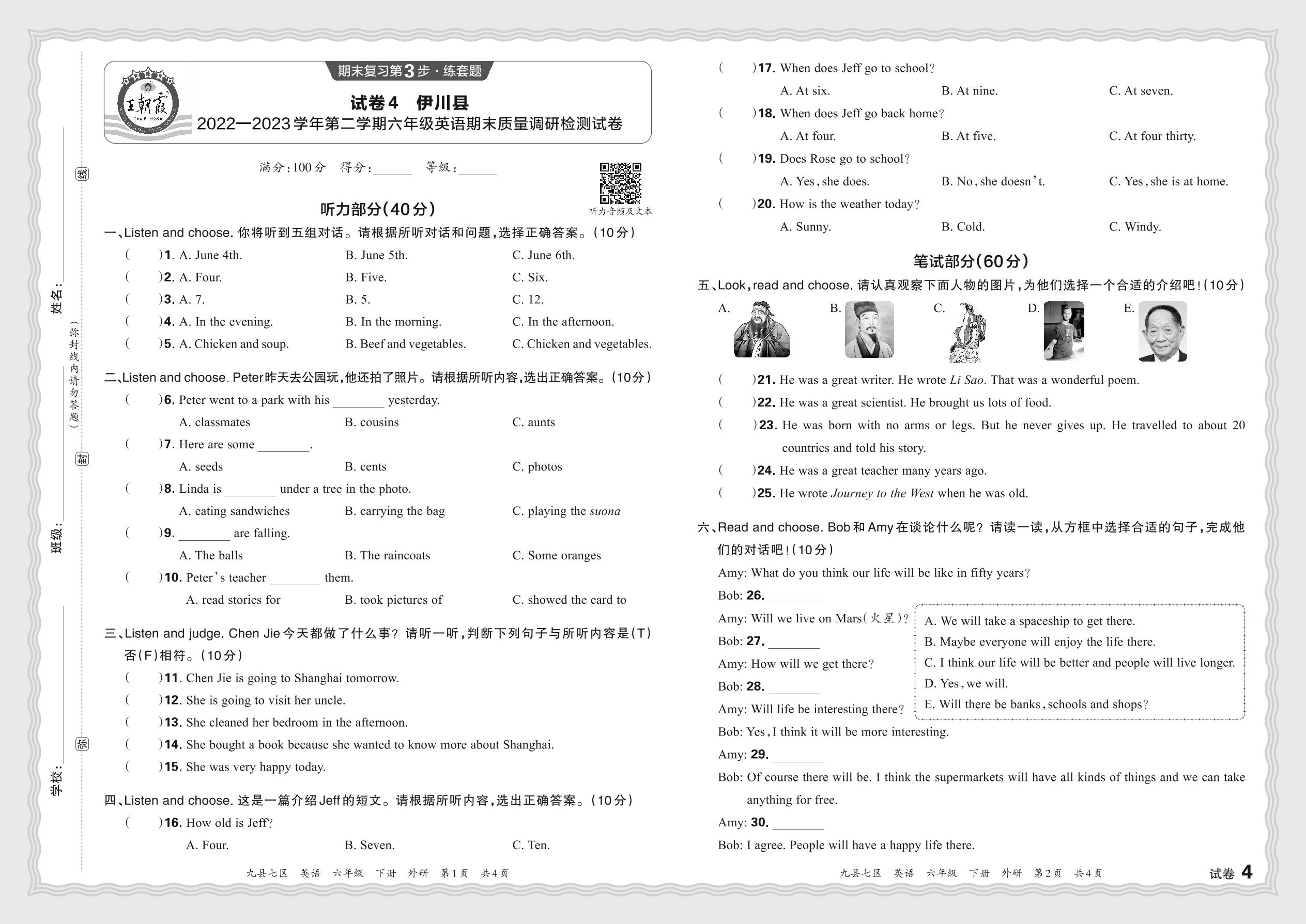 河南省洛阳市伊川县2022—2023学年第二学期六年级英语期末质量调研检测试卷(外研版)【4】