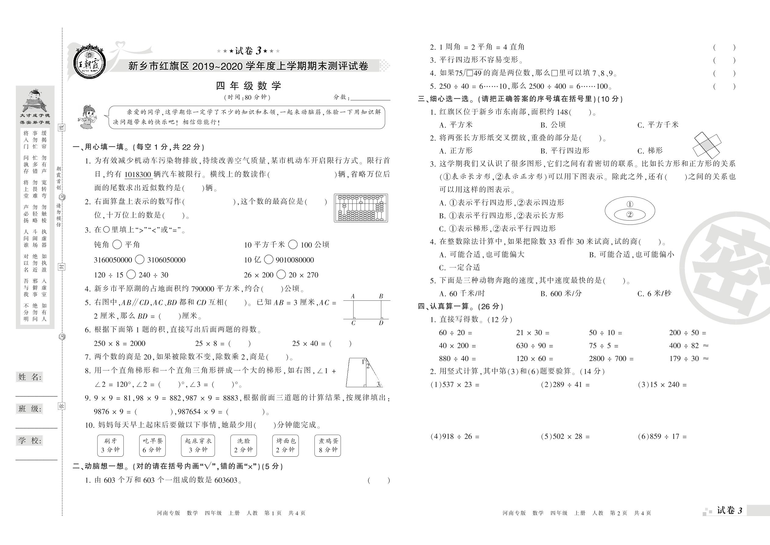 2019-2020学年第一学期新乡市红旗区四年级数学试卷(人教版)【3】