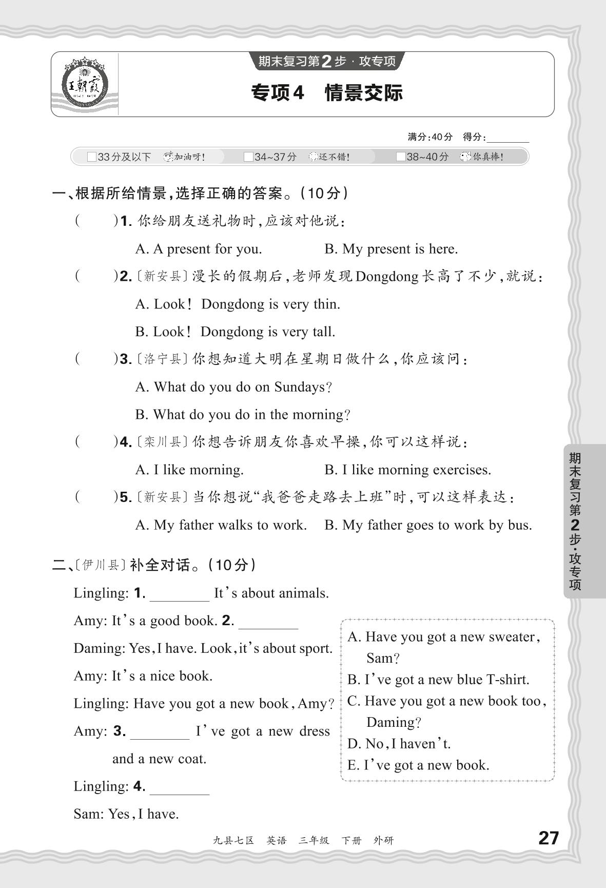 2024春下册三年级英语外研版 期末专项卷洛阳版·情景交际【4】