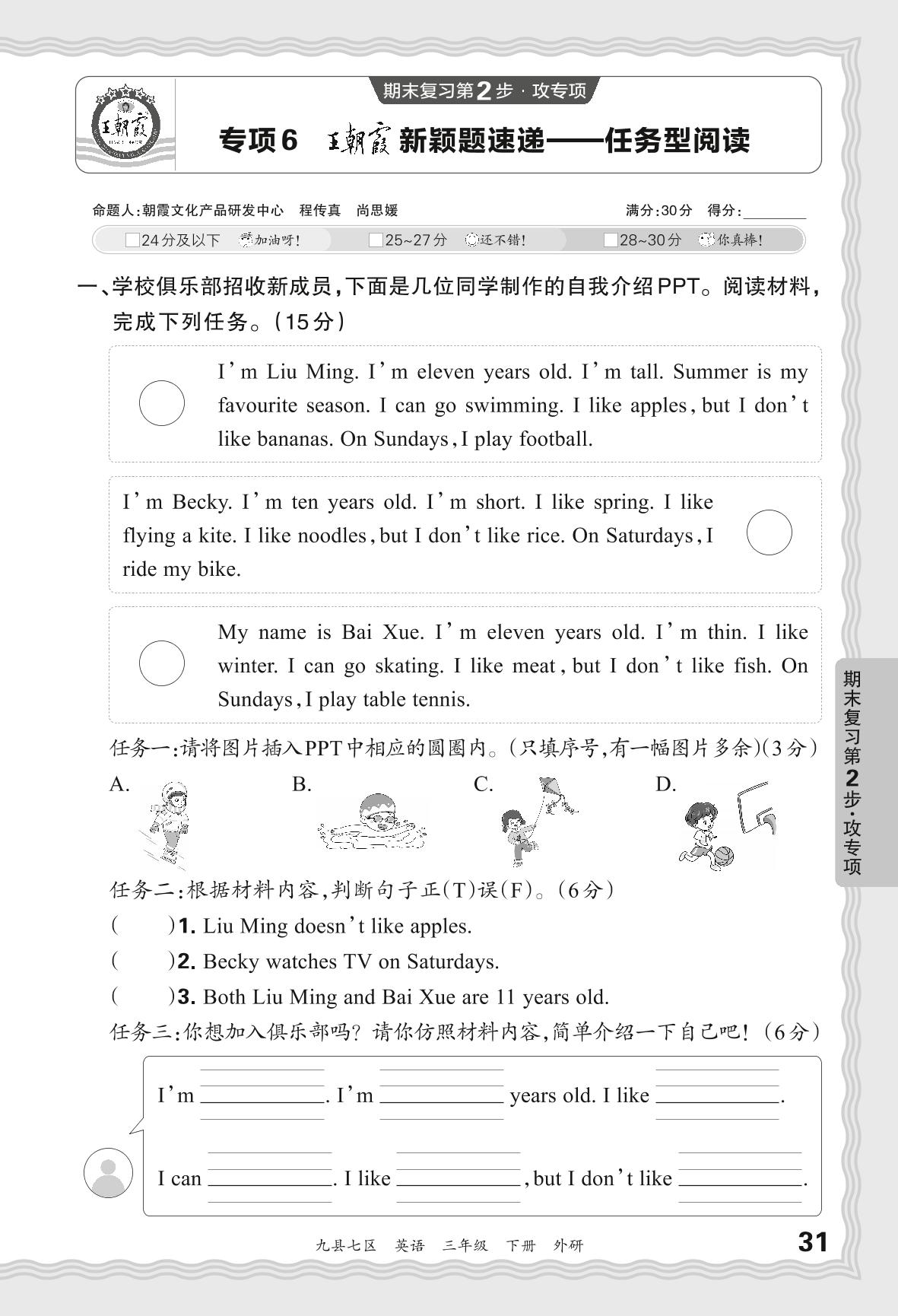 2024春下册三年级英语外研版 期末专项卷洛阳版·王朝霞新颖题速递——任务型阅读【6】