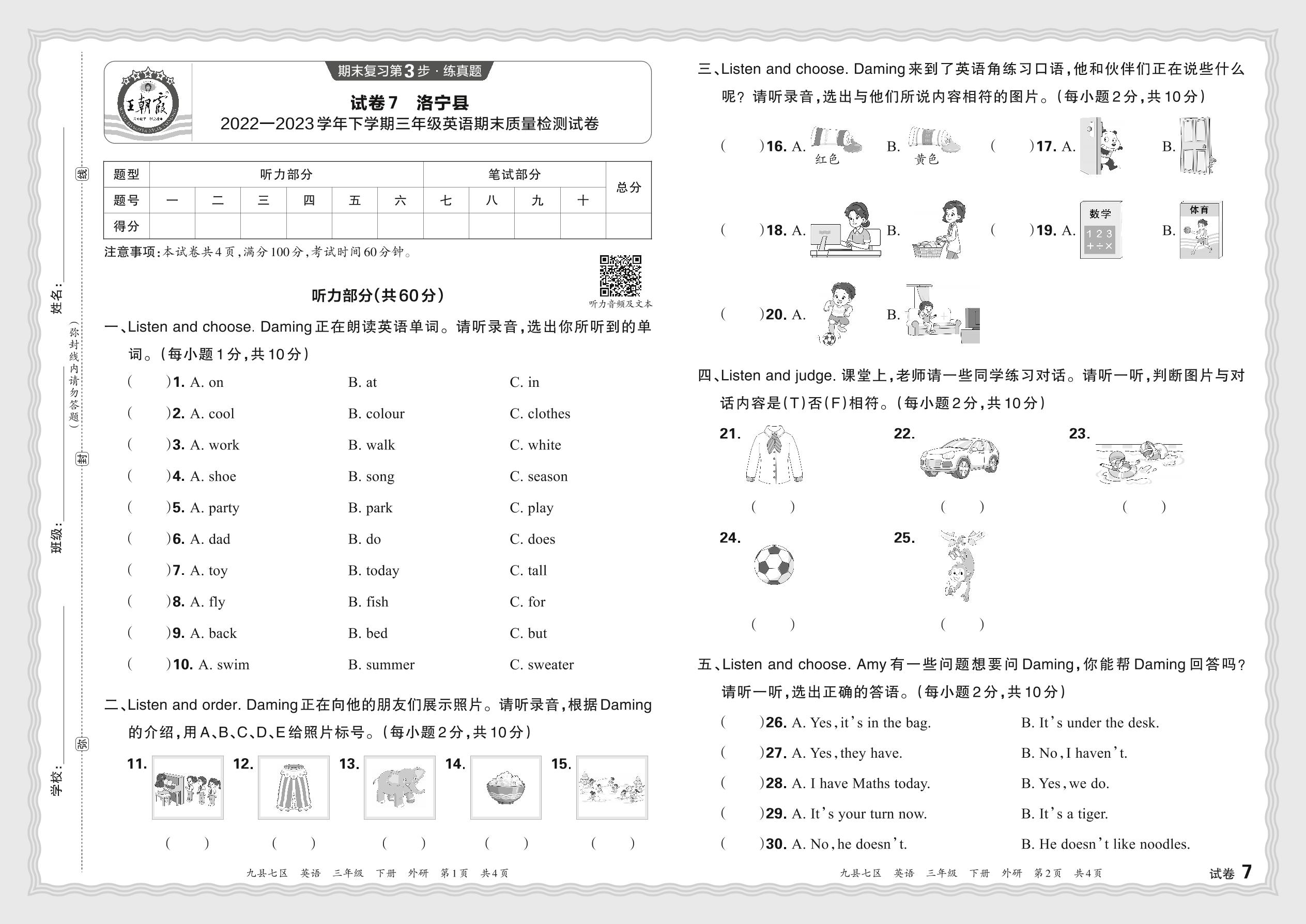 河南省洛阳市洛宁县2022—2023学年下学期三年级英语期末质量检测试卷(外研版)【7】