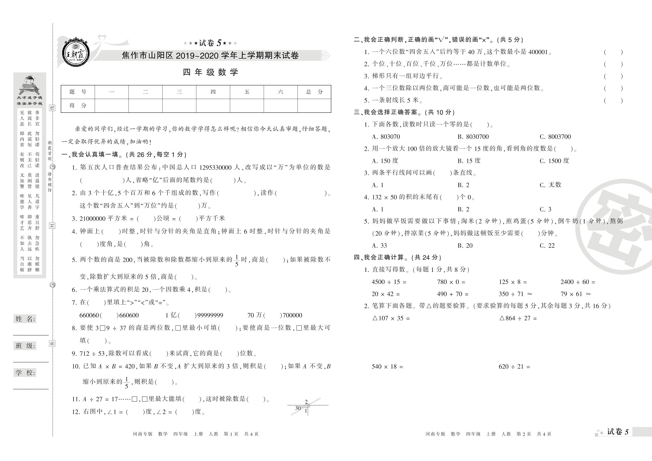 2019-2020学年第一学期焦作市山阳区四年级数学试卷(人教版)【5】