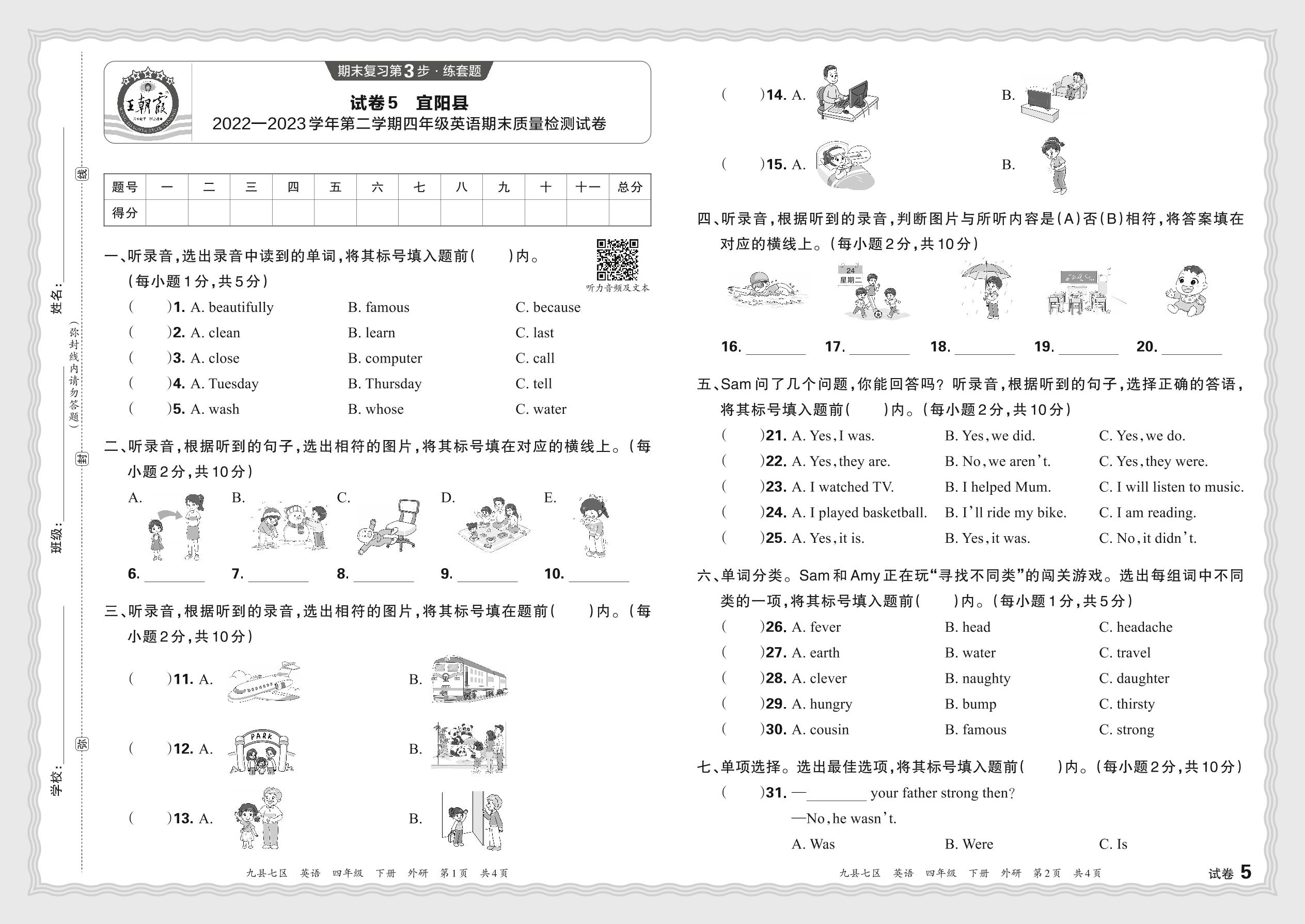 河南省洛阳市宜阳县2022—2023学年第二学期四年级英语期末质量检测试卷(外研版)【5】
