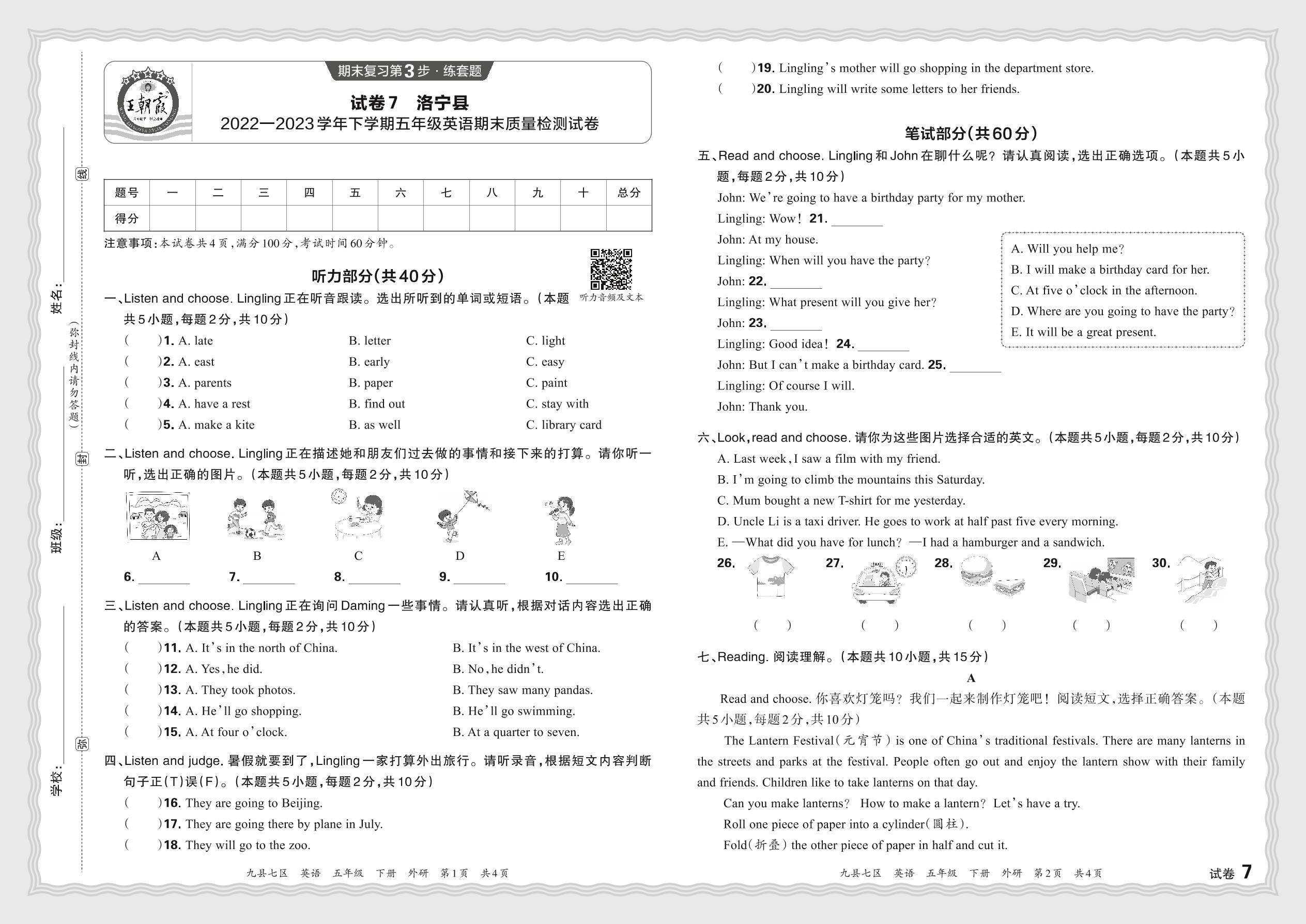 河南省洛阳市洛宁县2022—2023学年下学期五年级英语期末质量检测试卷(外研版)【7】