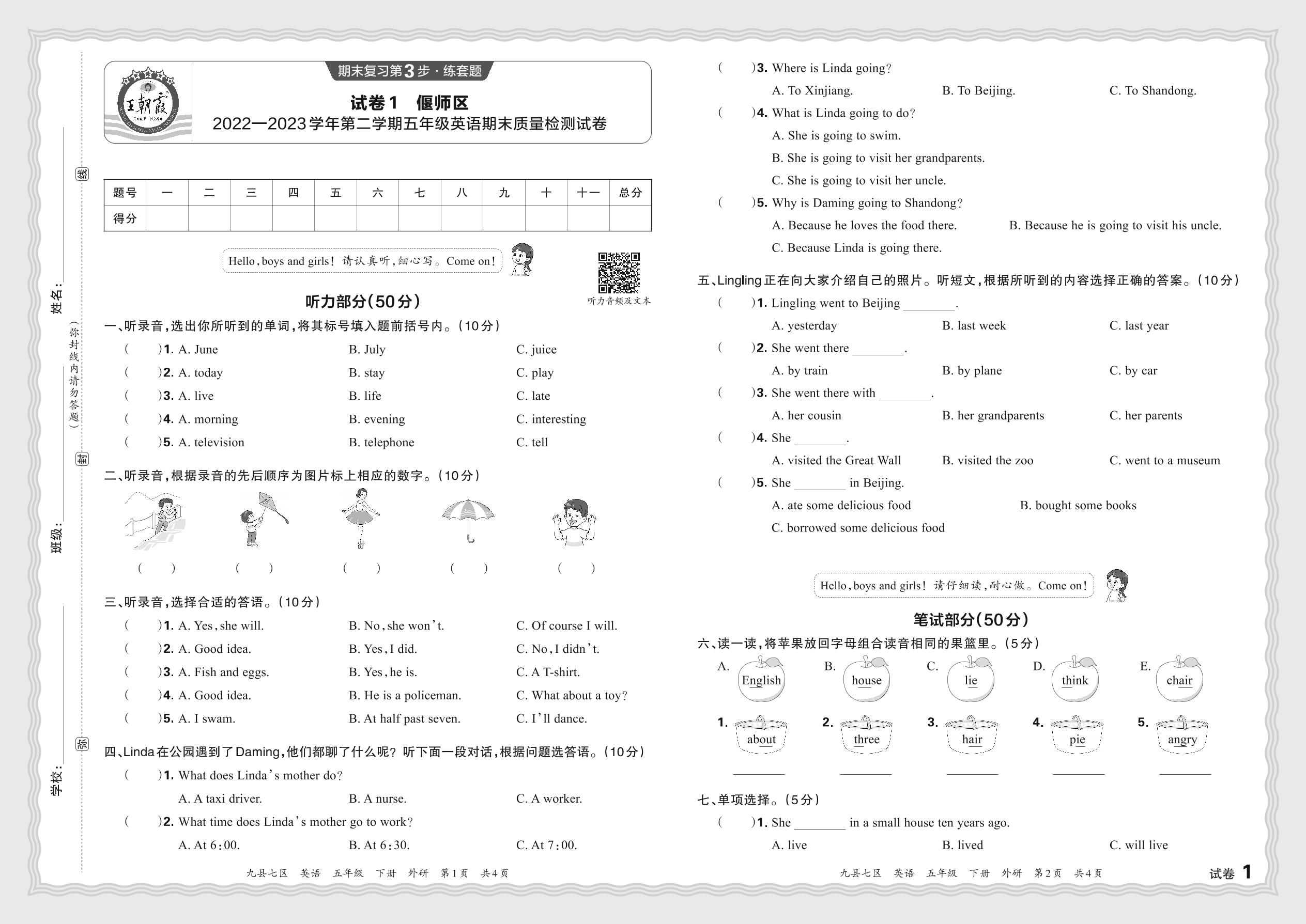 河南省洛阳市偃师区2022—2023学年第二学期五年级英语期末质量检测试卷(外研版)【1】
