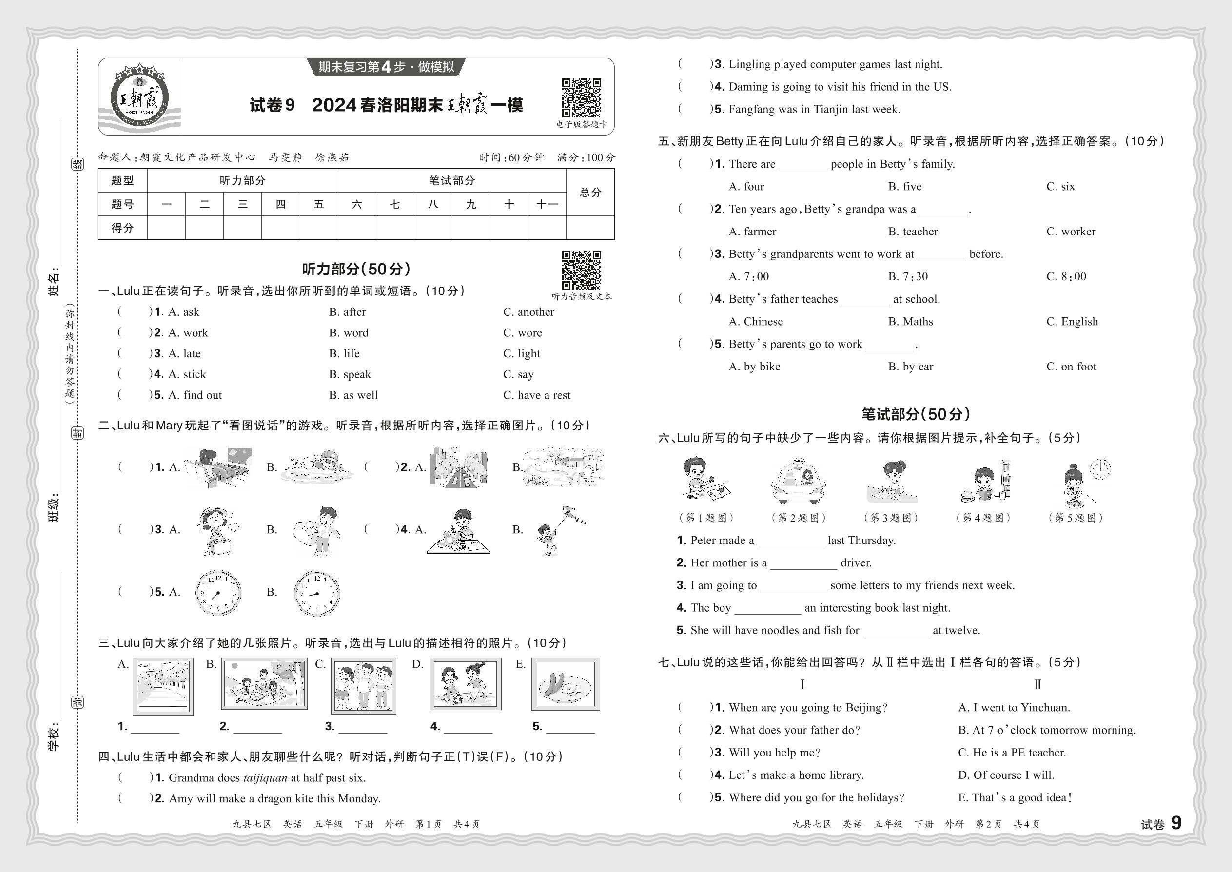 2024春下册五年级英语外研版 河南洛阳期末王朝霞一模【9】
