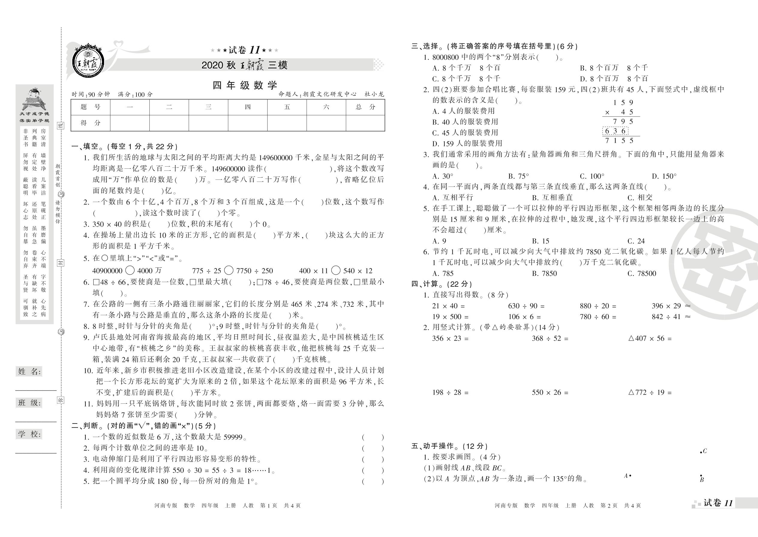 王朝霞期末模拟卷四年级上册数学(人教版)_R210804140450【11】