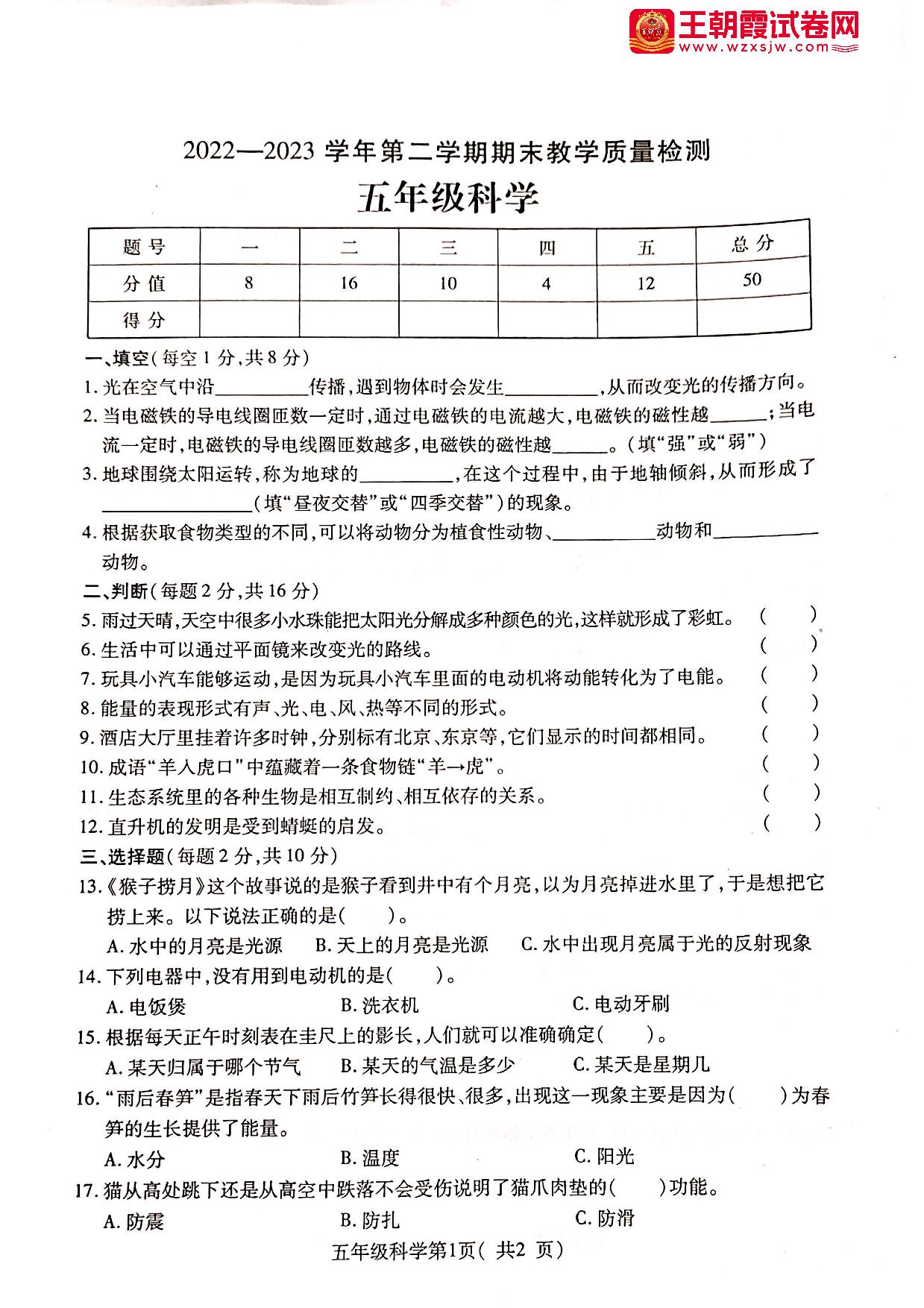 河南省许昌市襄城县2022—2023学年下学期期末教学质量检测五年级科学(大象版)