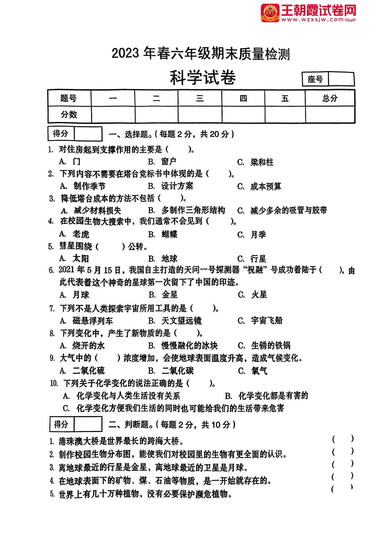 河南省商丘市柘城县2022—2023学年下学期期末质量检测六年级科学(教科版)