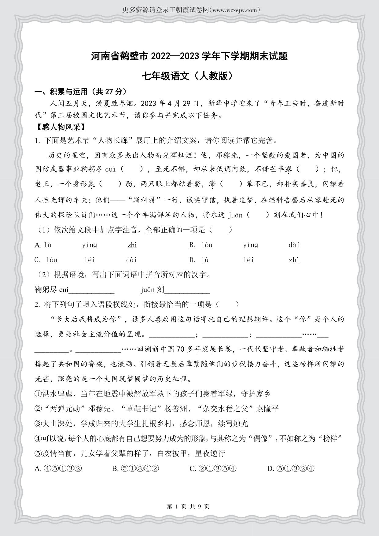 河南省鹤壁市2022—2023学年下学期期末试题七年级语文(人教版)