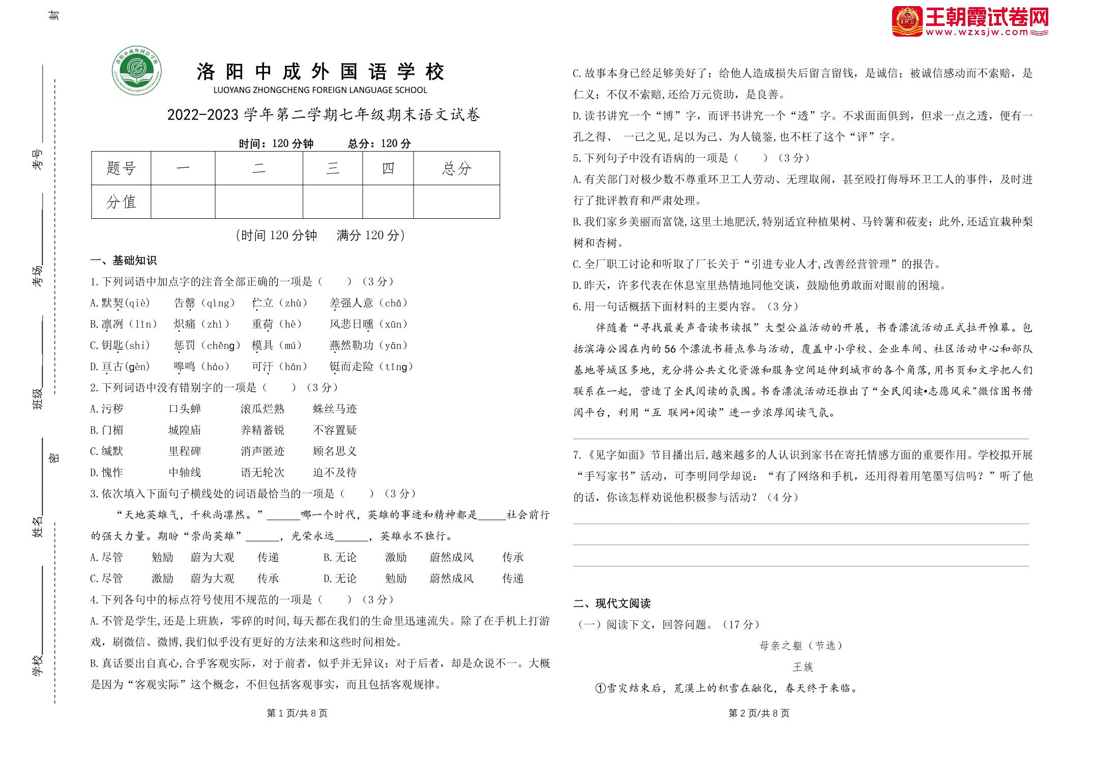 河南省洛阳中成外国语学校2022—2023学年七年级下学期期末考试试题语文(人教版)