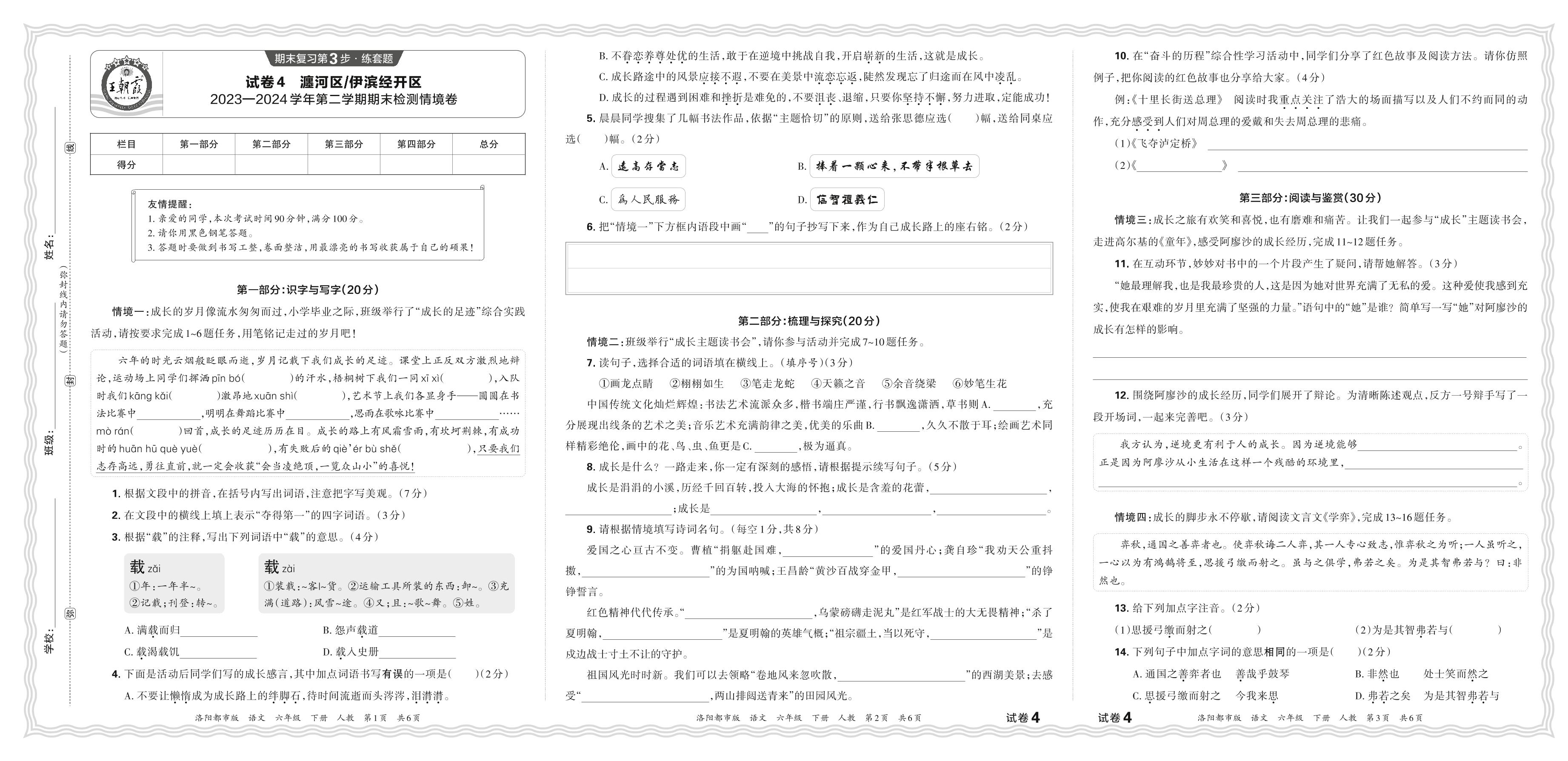 河南省洛阳市瀍河区、伊滨经开区2023—2024学年第二学期六年级语文期末检测情境卷(人教版)【4】