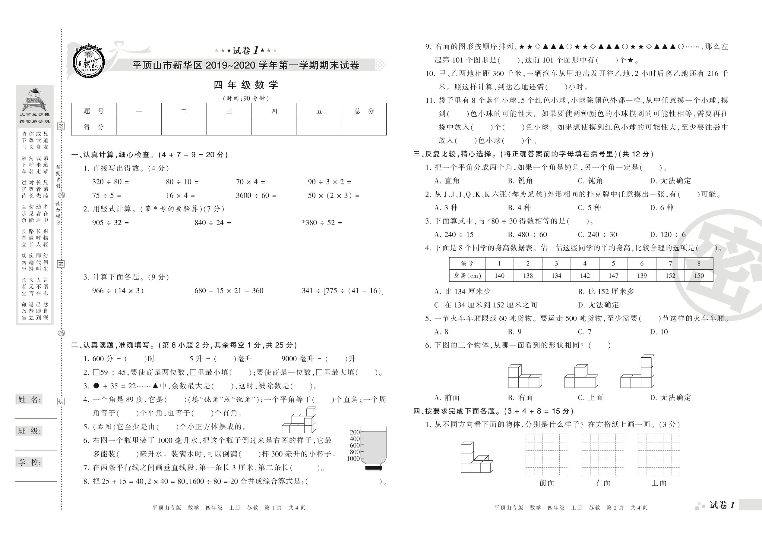 2019-2020学年第一学期平顶山市新华区四年级数学试卷(苏教版)_R210804140506【1】