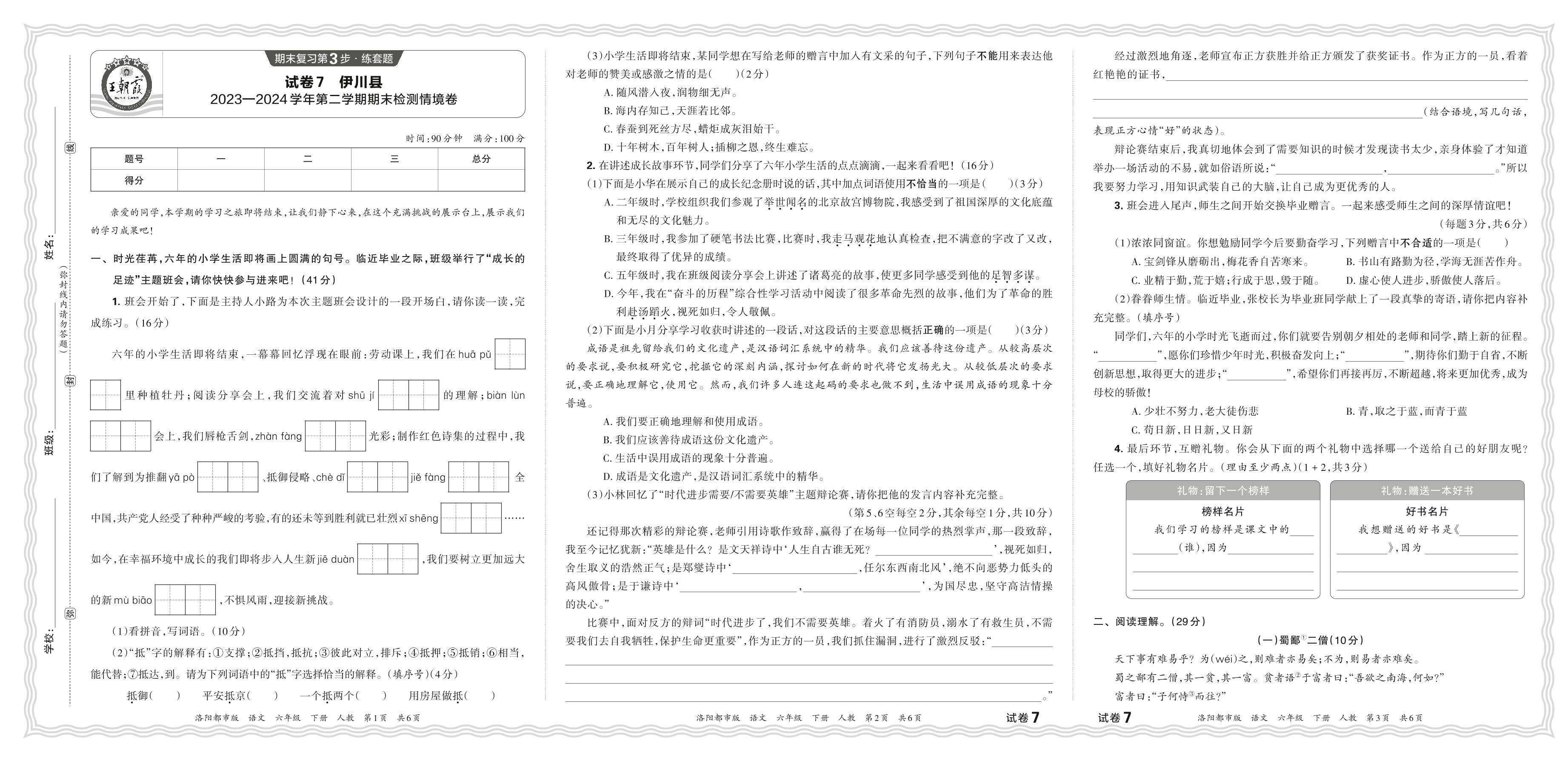 河南省洛阳市伊川县2023—2024学年第二学期六年级语文期末检测情境卷(人教版)【7】