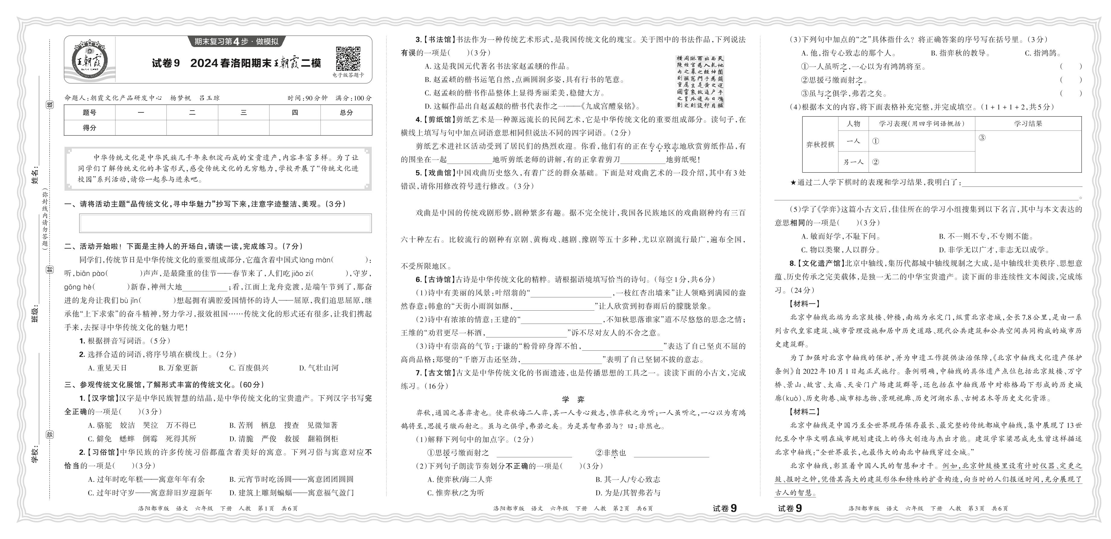 2024春下册六年级语文人教版 河南洛阳期末王朝霞二模
