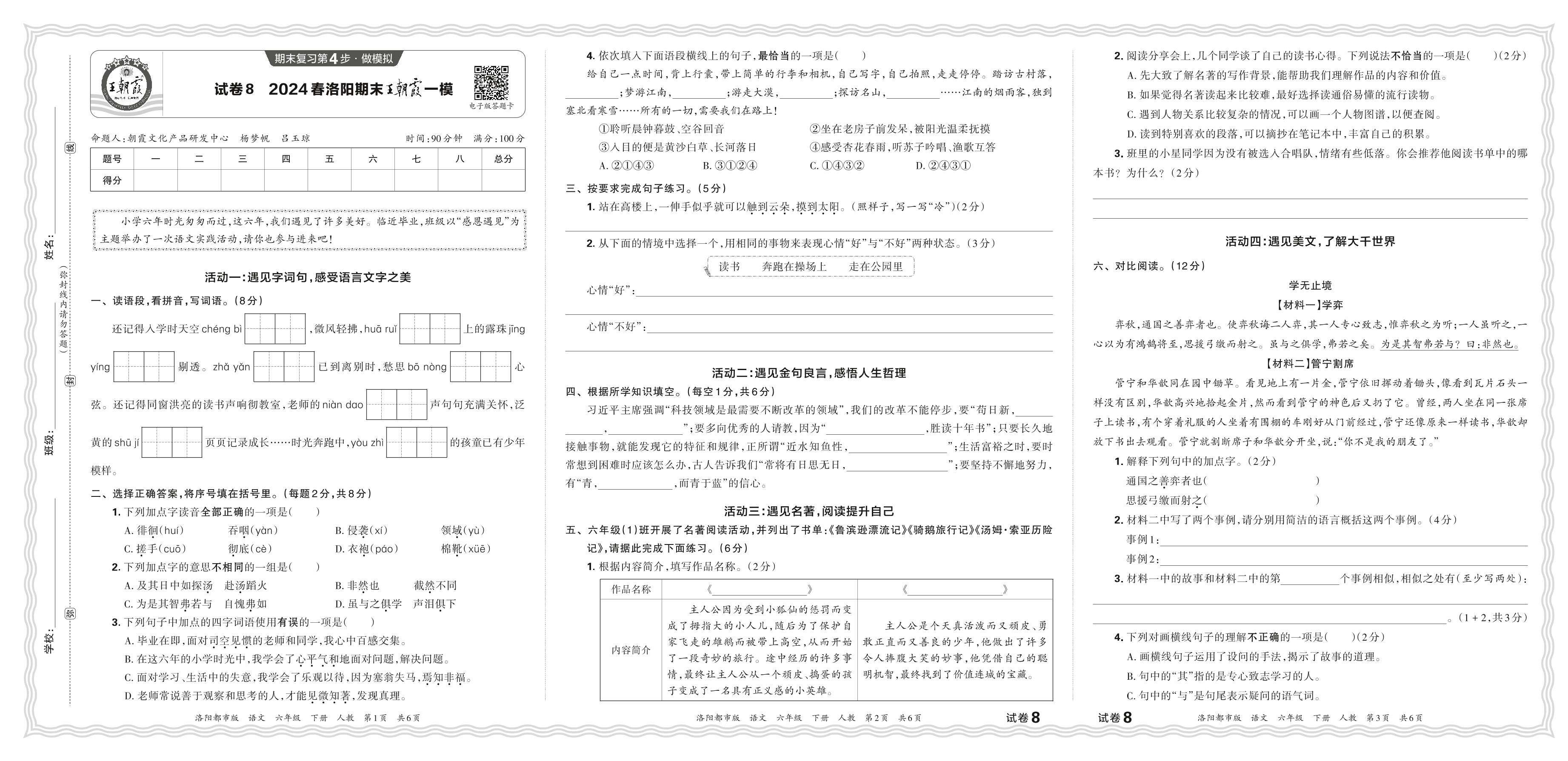 2024春下册六年级语文人教版 河南洛阳期末王朝霞一模