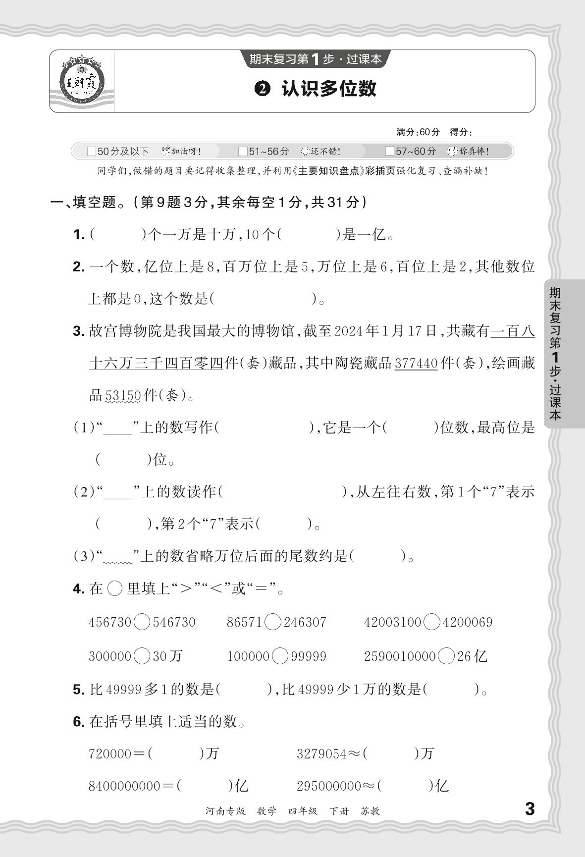 2024春下册四年级数学苏教版 期末过课本河南版·认识多位数【2】
