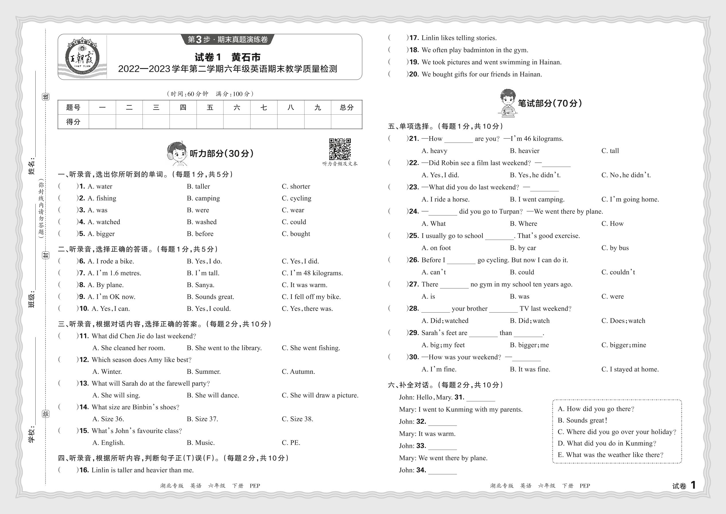 湖北省黄石市2022—2023学年第二学期六年级英语期末教学质量检测(人教PEP版)【1】
