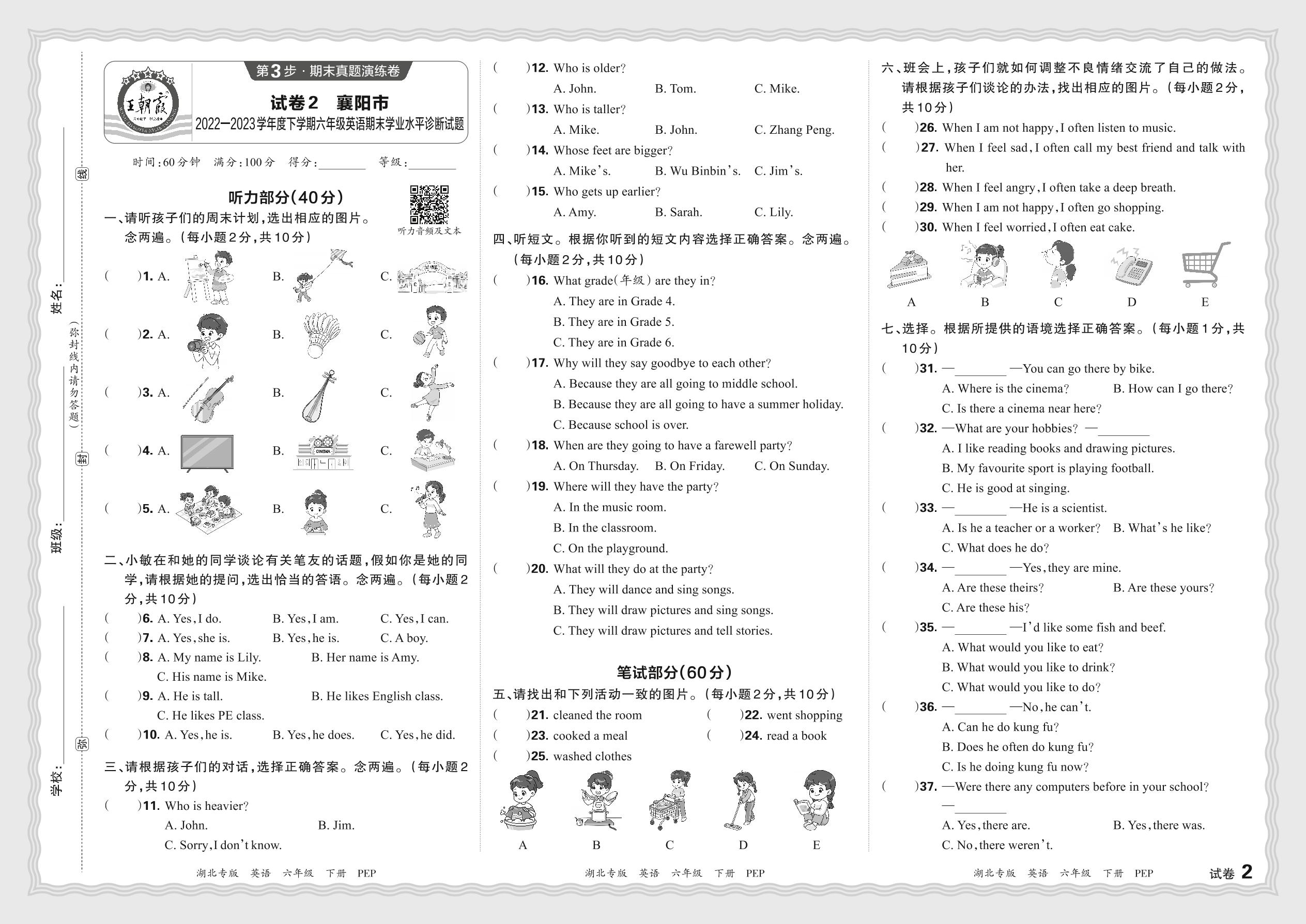 湖北省襄阳市2022—2023学年度下学期六年级英语期末学业水平诊断试题(人教PEP版)【2】