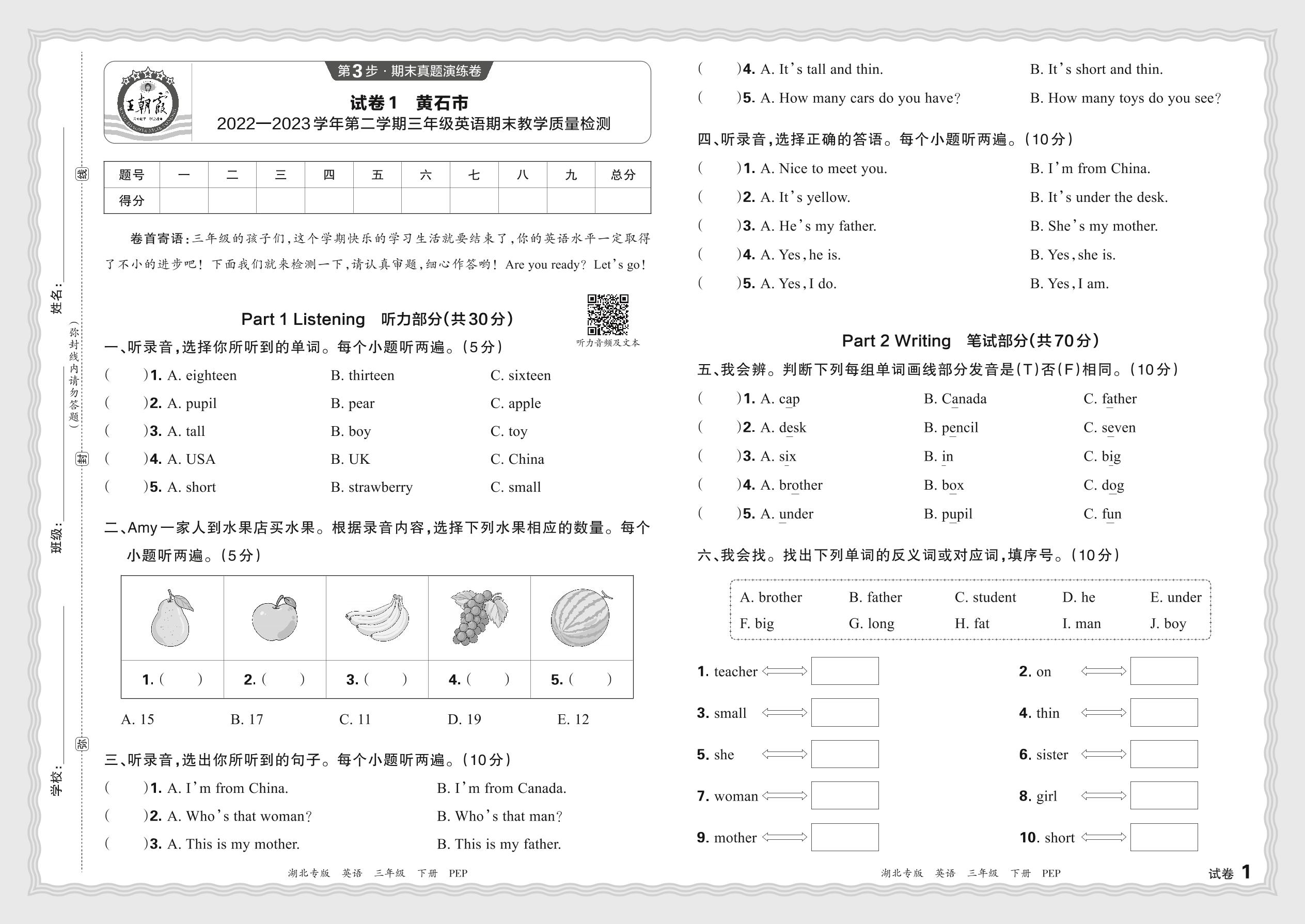 湖北省黄石市2022—2023学年第二学期三年级英语期末教学质量检测(人教PEP版)【1】