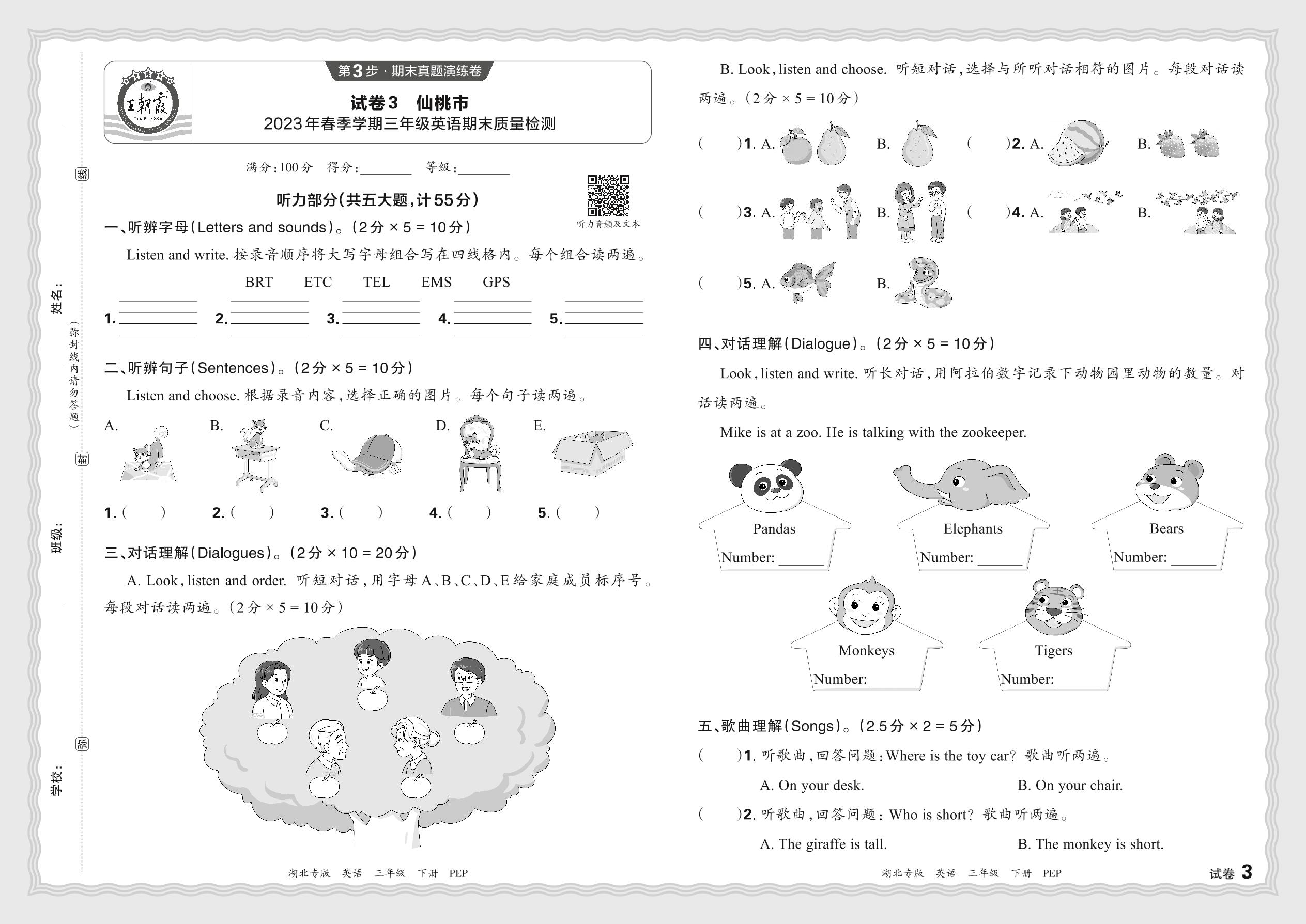 湖北省仙桃市2023春季学期三年级英语期末质量检测(人教PEP版)【3】