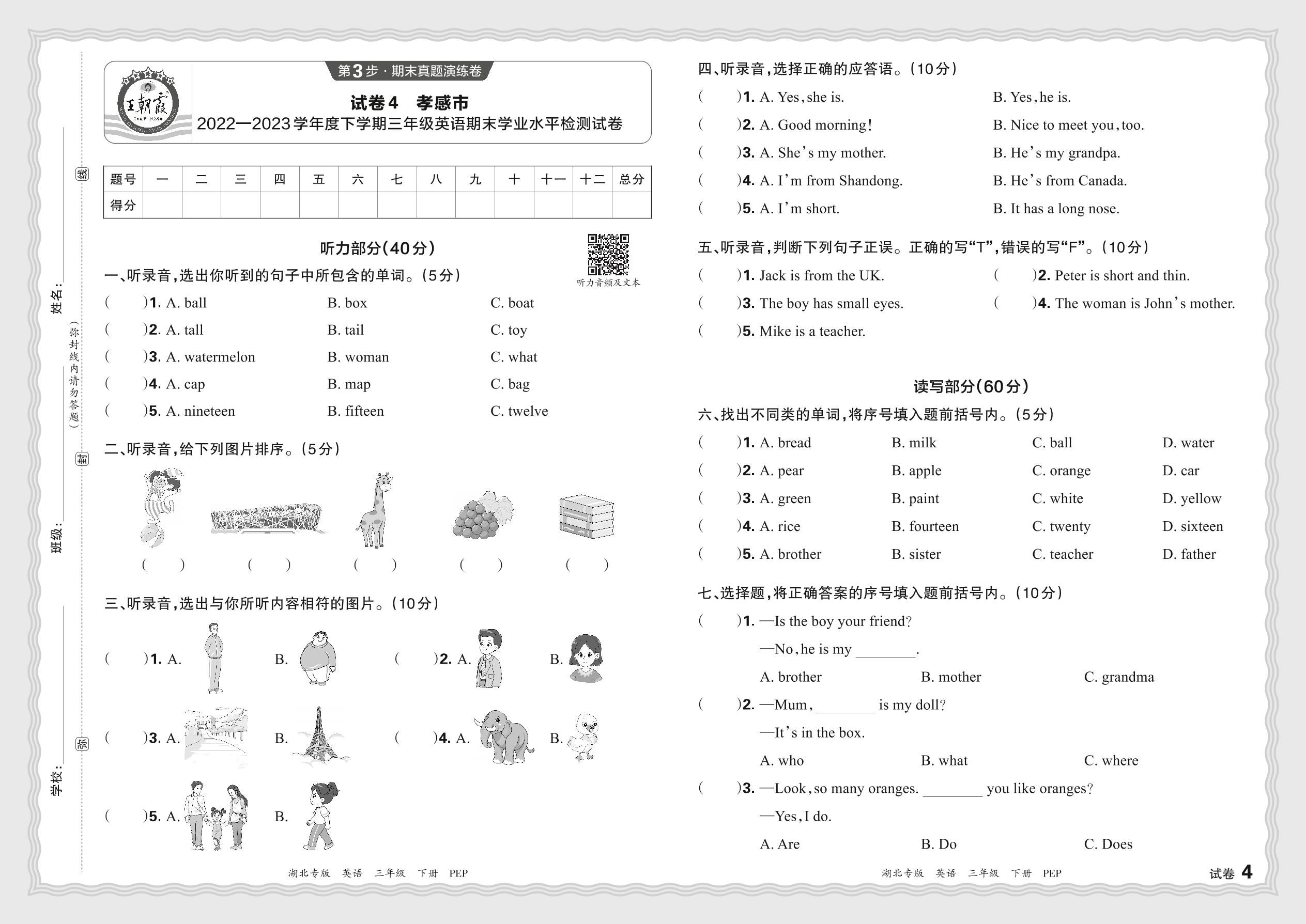 湖北省孝感市2022—2023学年度下学期三年级英语期末学业水平检测试卷(人教PEP版)【4】