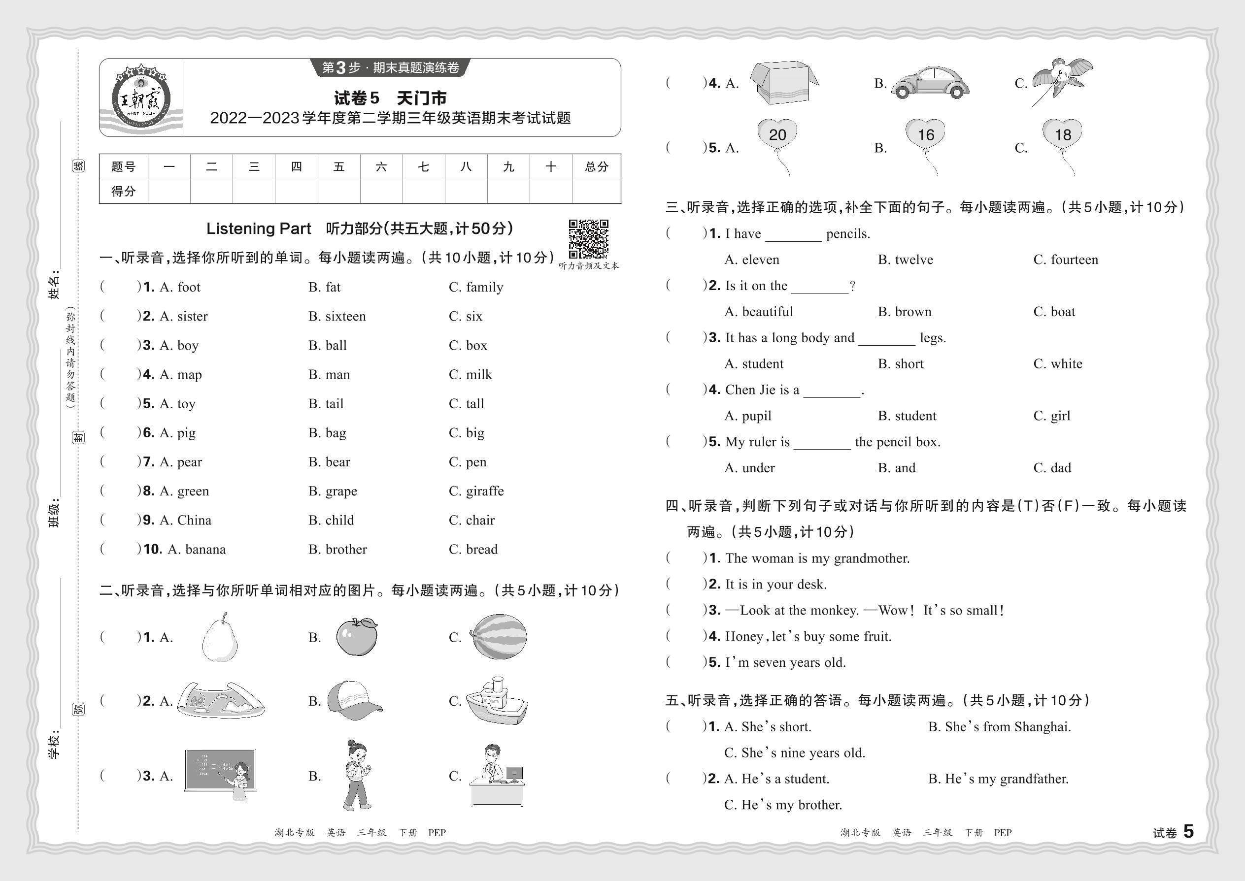 湖北省天门市2022—2023学年度第二学期三年级英语期末考试试题(人教PEP版)【5】