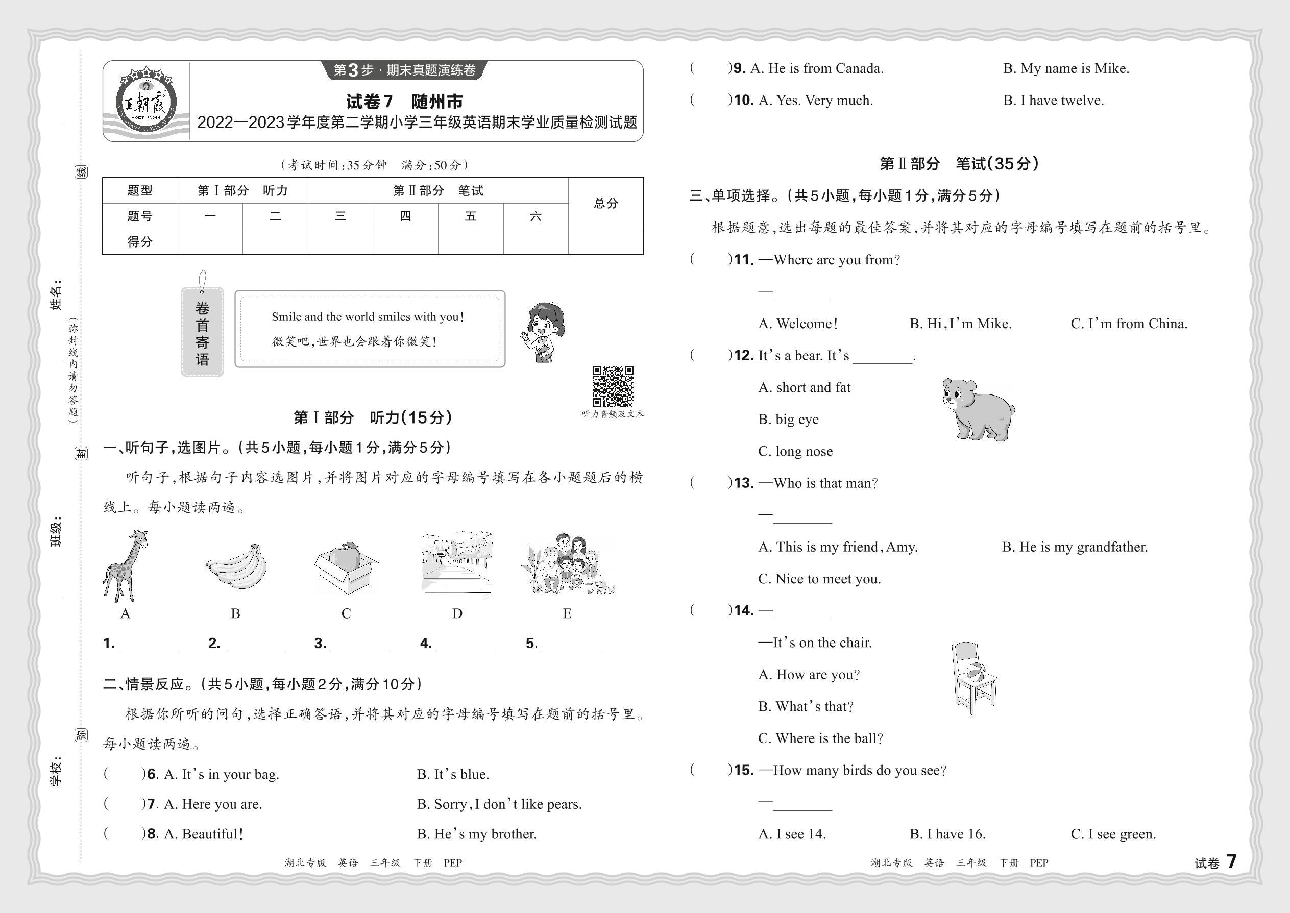 湖北省随州市2022—2023学年度第二学期小学三年级英语期末学业质量检测试题(人教PEP版)【7】