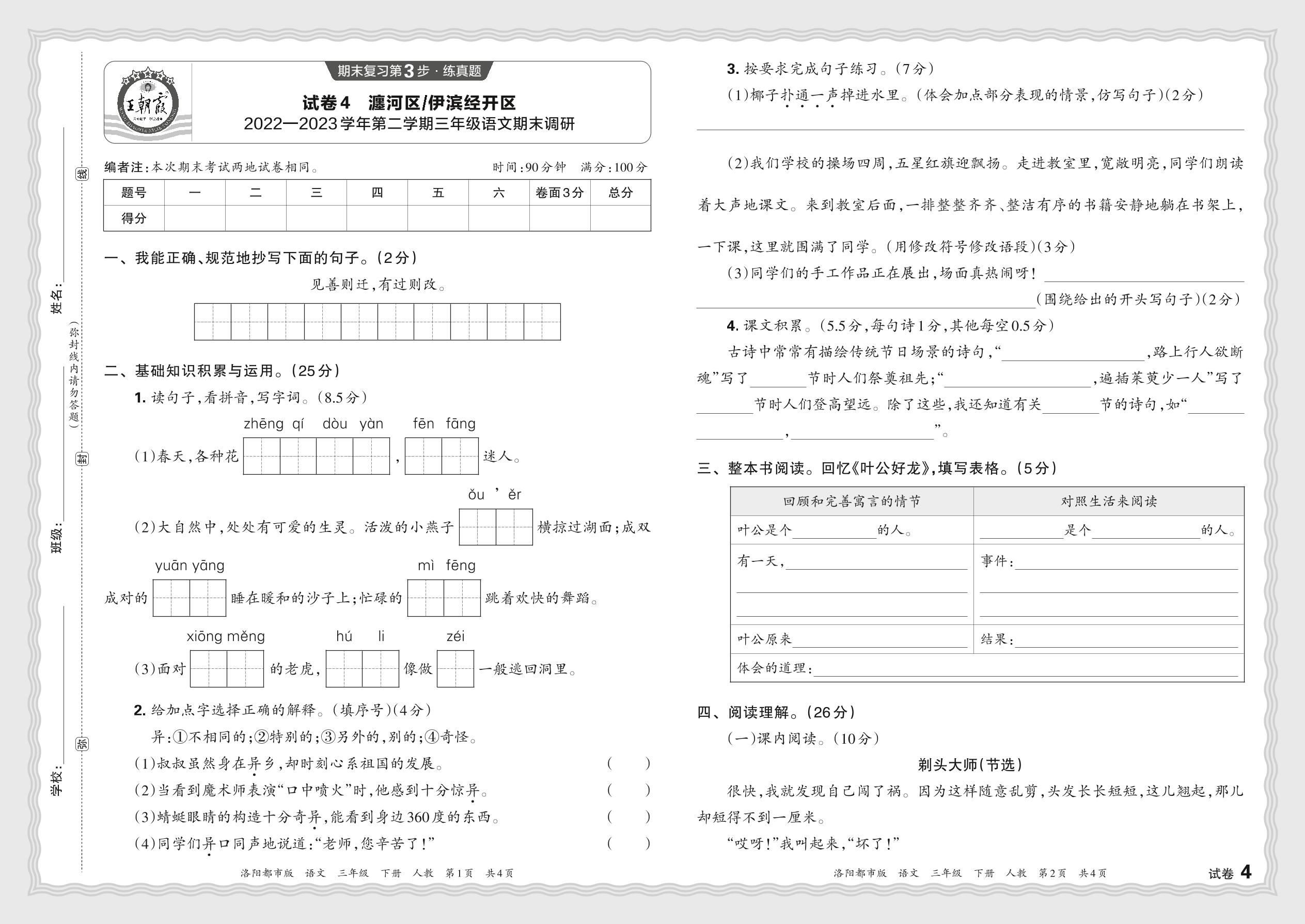 河南省洛阳市瀍河区、伊滨经开区2022—2023学年第二学期三年级语文期末调研(人教版)【4】