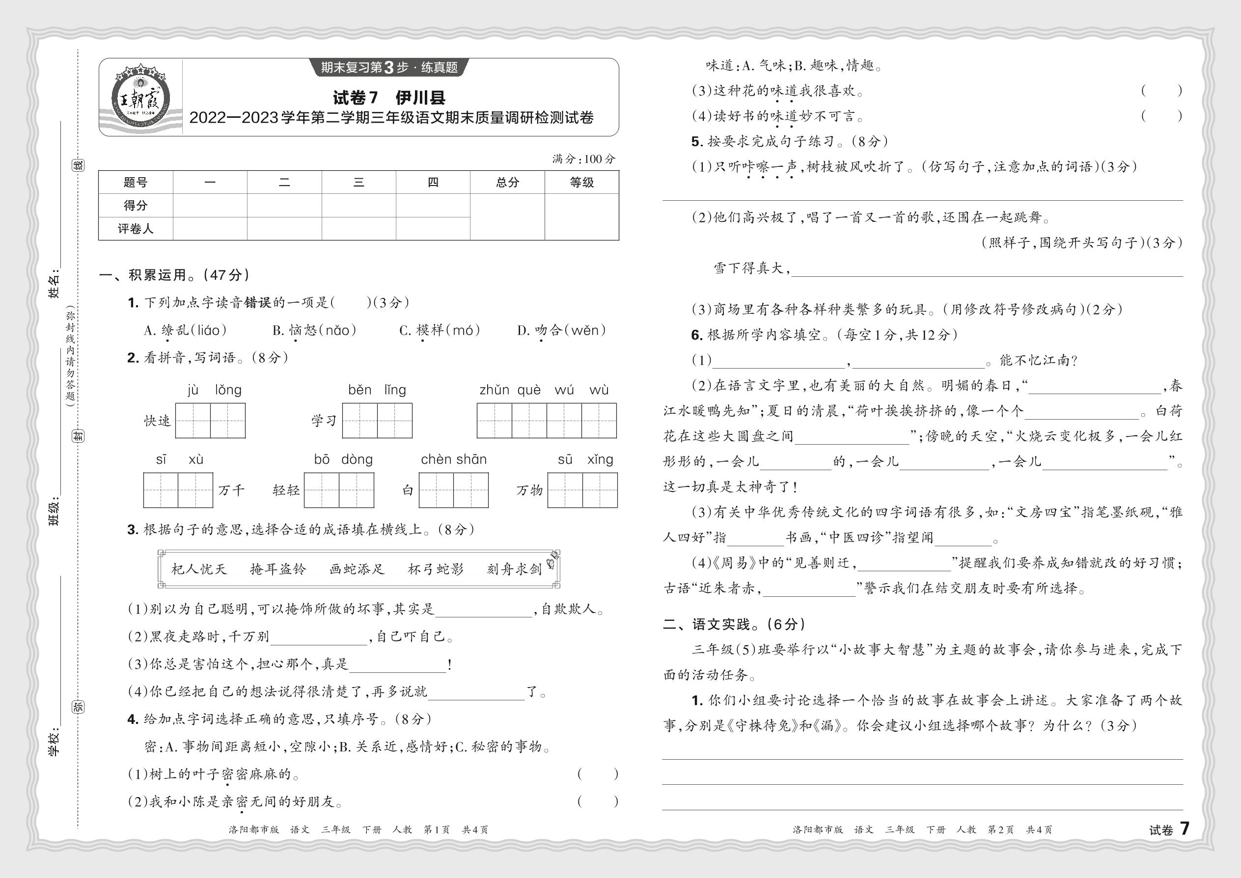河南省洛阳市伊川县2022—2023学年第二学期三年级语文期末质量调研检测试卷(人教版)【7】