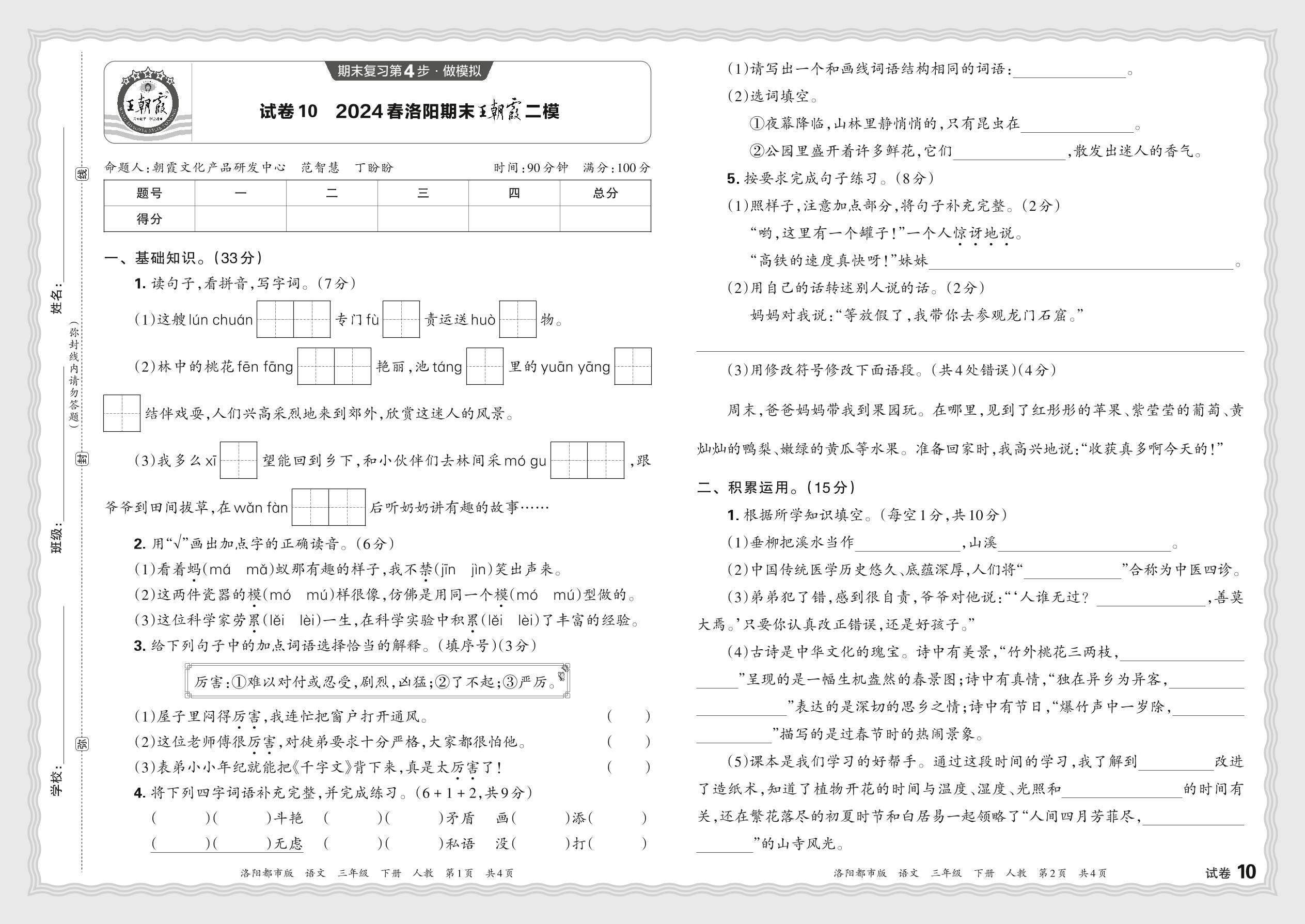2024春下册三年级语文人教版 河南洛阳期末王朝霞二模