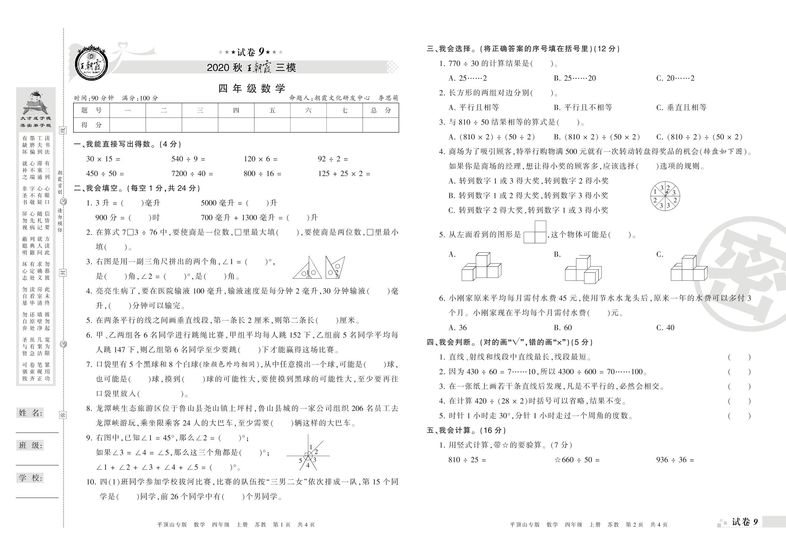 王朝霞期末模拟卷四年级上册数学(苏教版)_R210804140533【9】