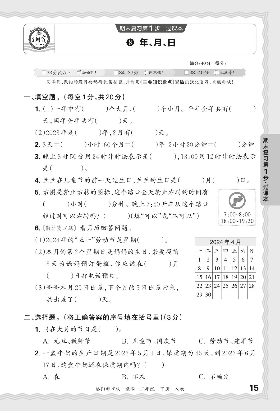 2024春下册三年级数学人教版 期末过课本洛阳版·年、月、日【8】