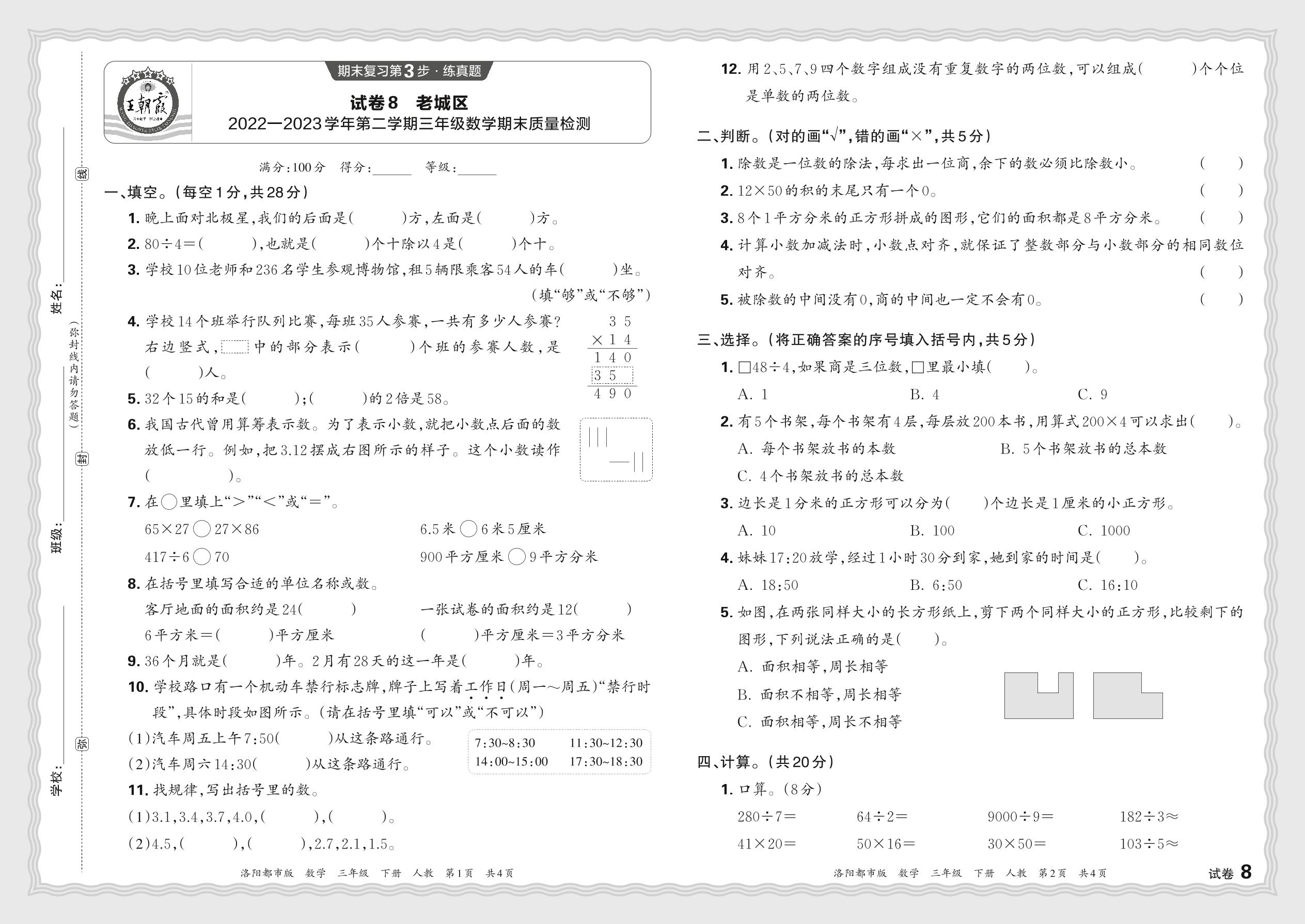河南省洛阳市老城区2022—2023学年第二学期三年级数学期末质量检测(人教版)【8】