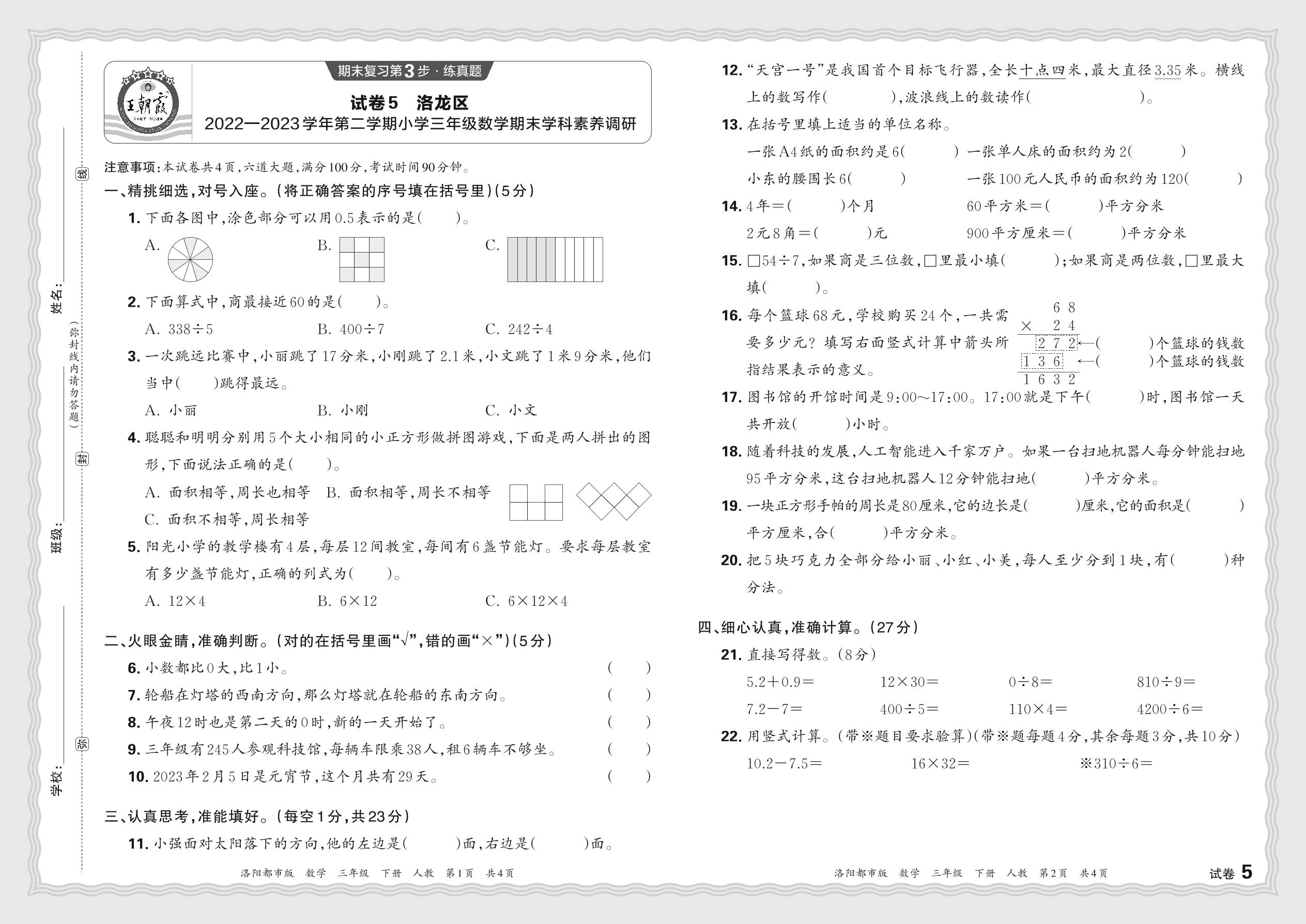 河南省洛阳市洛龙区2022—2023学年第二学期小学三年级数学期末学科素养调研(人教版)【5】