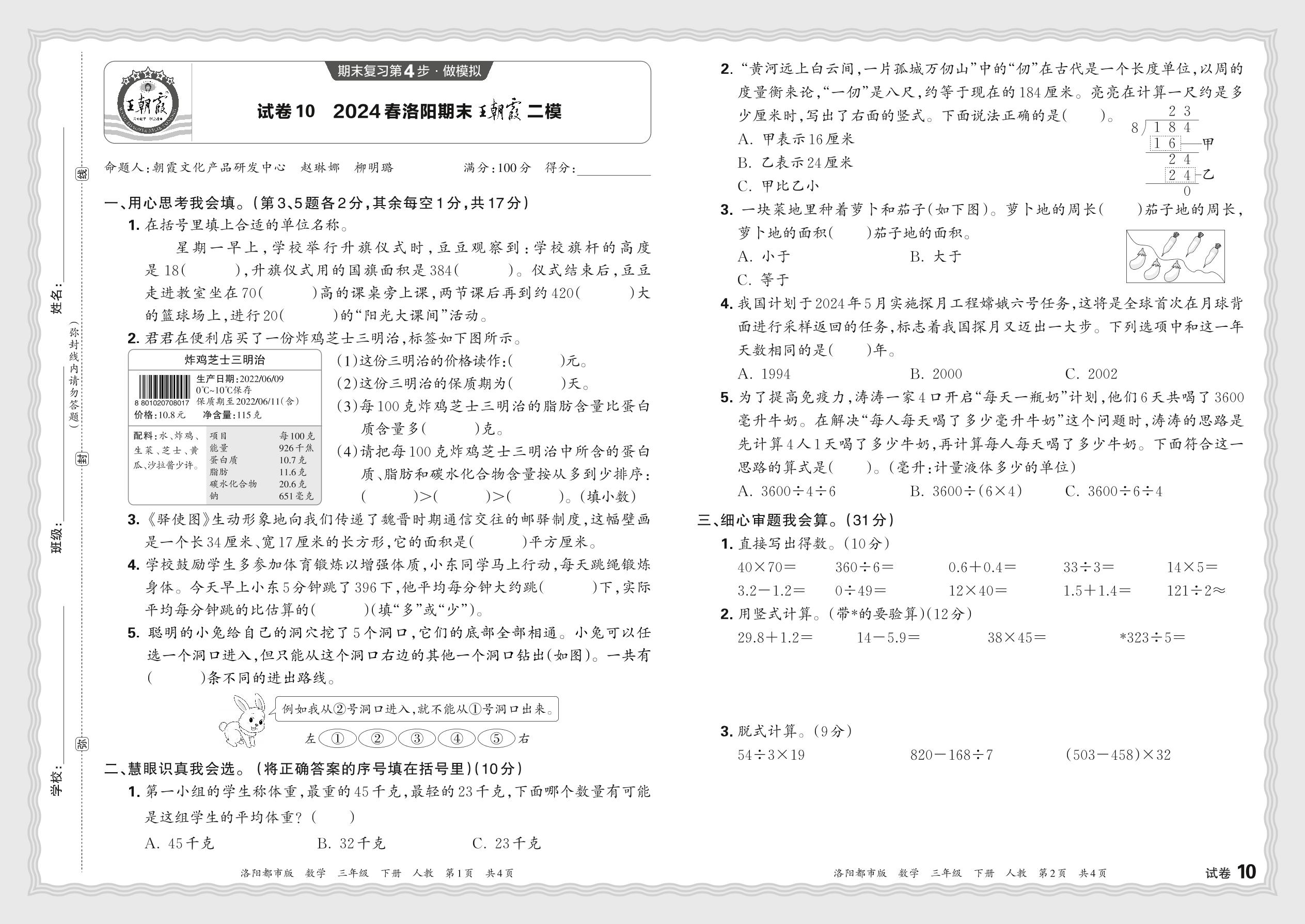 2024春下册三年级数学人教版 河南洛阳期末王朝霞二模