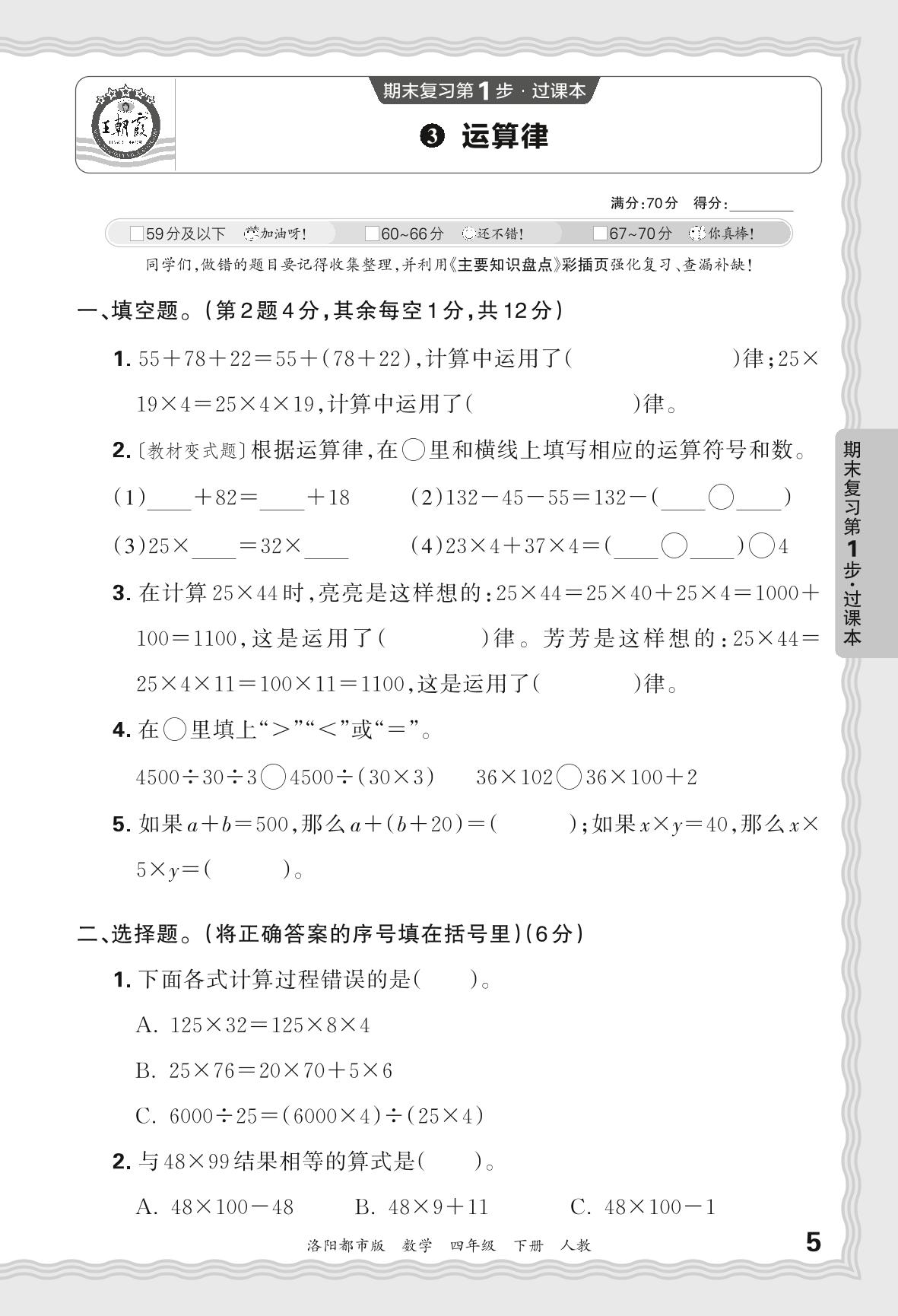 2024春下册四年级数学人教版 期末过课本洛阳版·运算律【3】