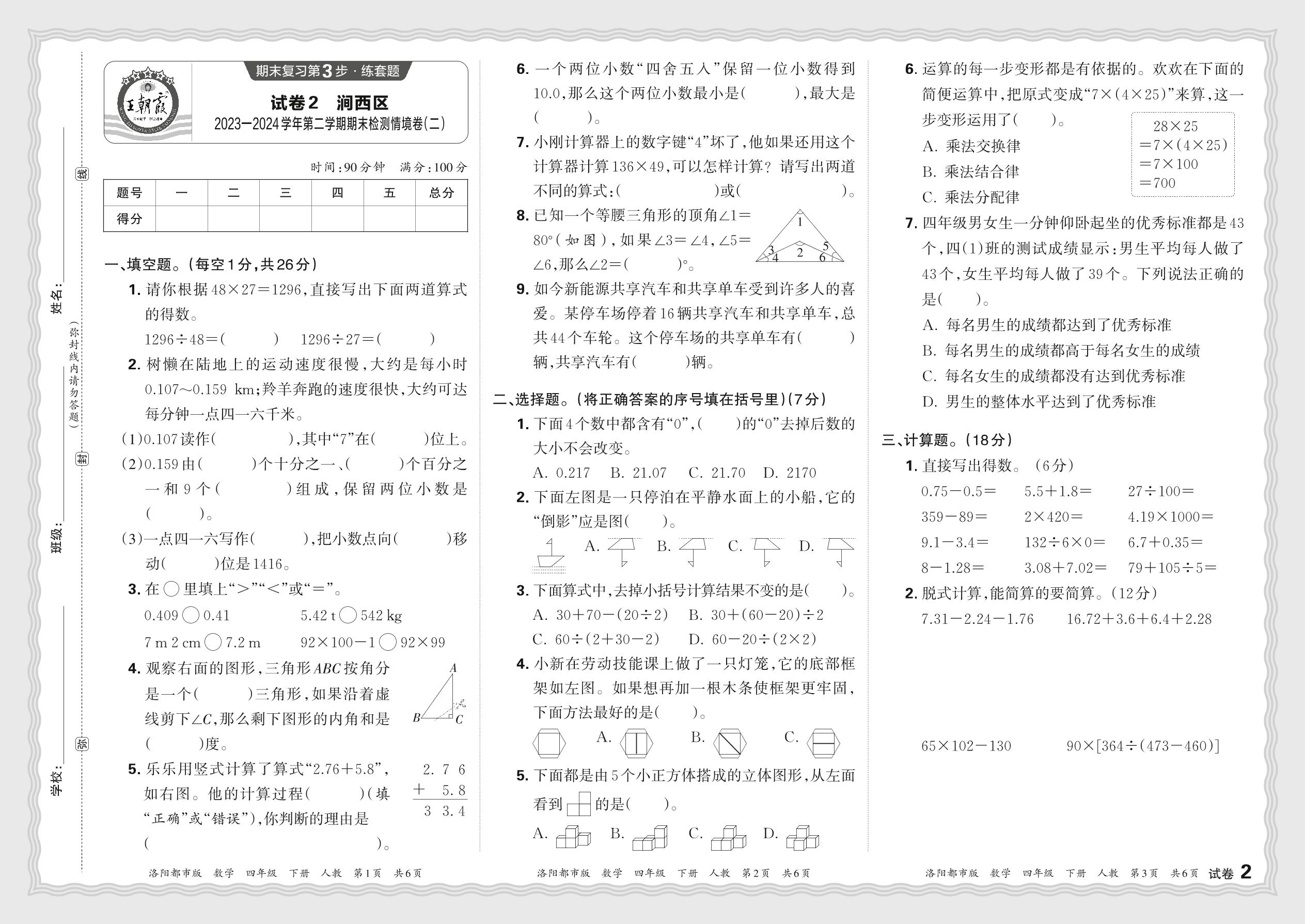河南省洛阳市涧西区2023—2024学年第二学期四年级数学期末检测情境卷(二)(人教版)【2】